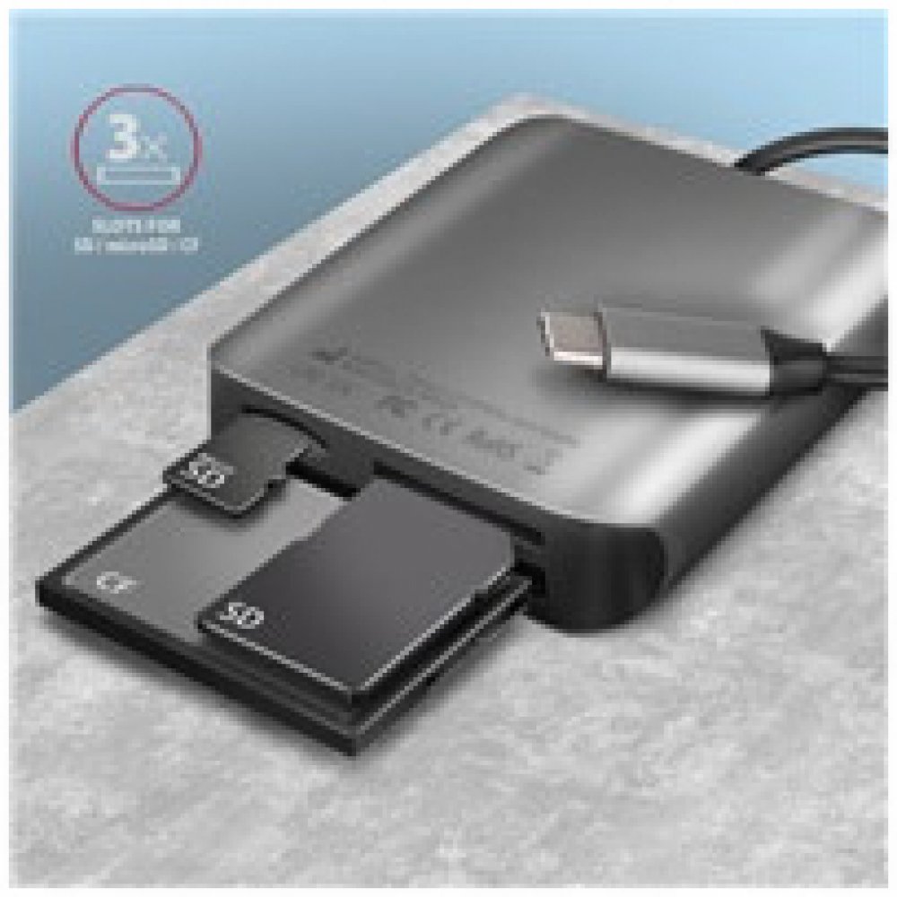 Hliníková 3in1 čtečka paměťových karet AXAGON CRE-S3C SUPERSPEED s USB 3.2 Gen 1 rozhraním podporuje všechny současné verze SD a microSD karet včetně SDXC a microSDXC s kapacitou až 2TB. Dále podporuje CF karty o kapacitě až 128PT. Díky modernímu oboustrannému USB-C konektoru čtečku snadno připojíte k notebooku, telefonu nebo počítači s USB-C konektorem.