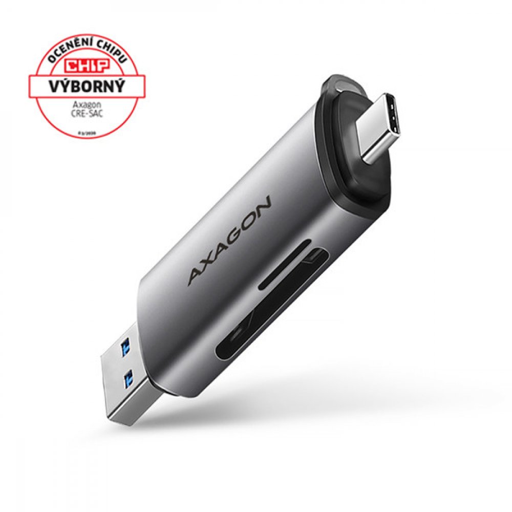 Univerzální kompaktní SuperSpeed USB čtečka paměťových karet AXAGON CRE-SAC podporuje všechny současné verze SD a microSD karet včetně SDXC a microSDXC s kapacitou až 2TB.