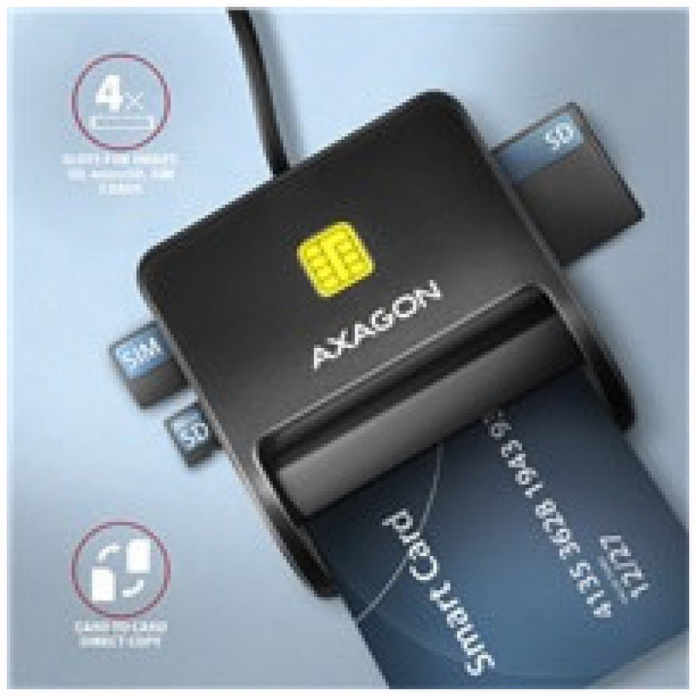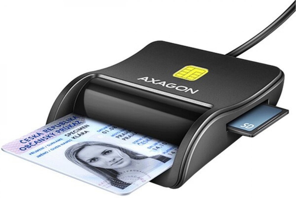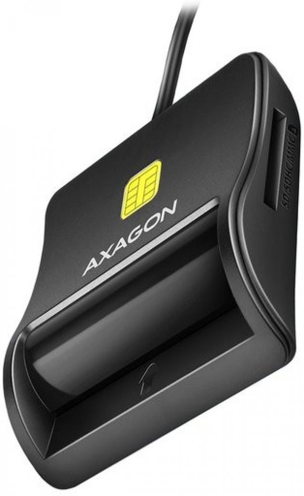 Kompaktní stolní čtečka Smart card / ID card AXAGON CRE-SM3SD FlatReader s USB 2.0 rozhraním obsahuje navíc sloty pro paměťové karty SD, microSD a SIM karty. Card reader podporuje všechny běžné formáty kontaktních Smart karet, čipových karet a dalších karet včetně kontaktních bankovních platebních karet nebo kontaktních elektronických občanských průkazů *. Čtečka je plně kompatibilní s aplikací eO...