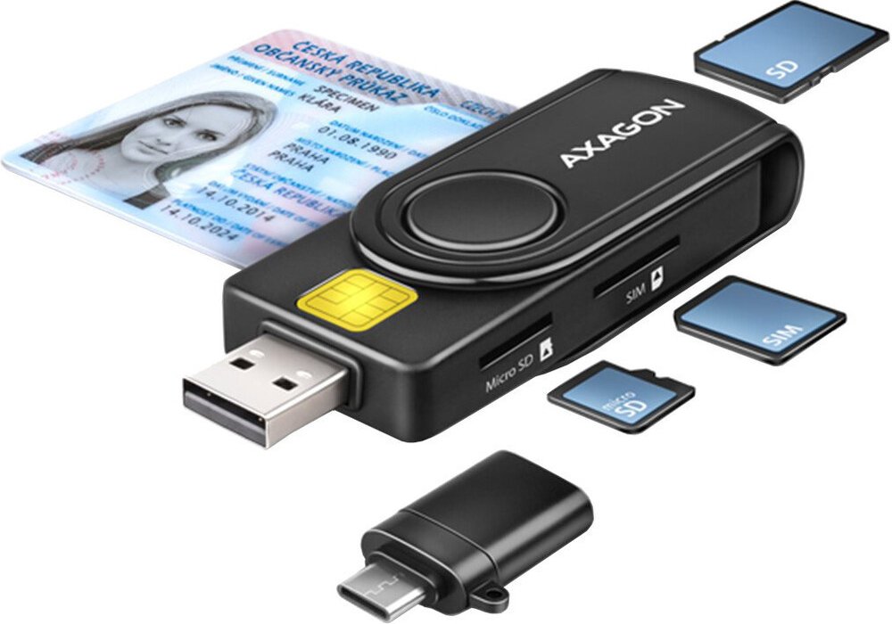 Kompaktní cestovní čtečka Smart card / ID card AXAGON CRE-SMP2A PocketReader s USB 2.0 rozhraním obsahuje navíc sloty pro paměťové karty SD, microSD a SIM karty. Card reader podporuje všechny běžné formáty kontaktních Smart karet, čipových karet a dalších karet včetně kontaktních bankovních platebních karet nebo kontaktních elektronických občanských průkazů *. Čtečka je plně kompatibilní s aplikac...