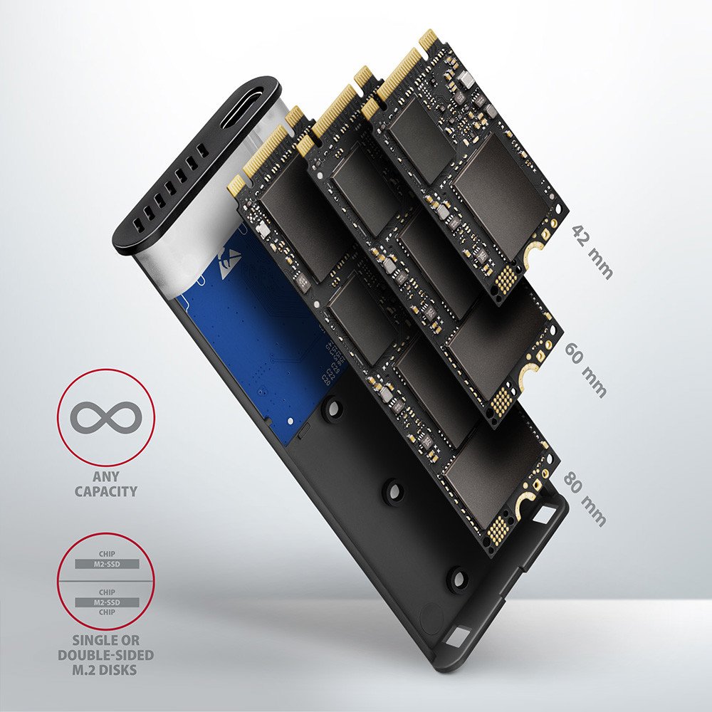 Unikátní vlastností, díky novému čipsetu, je možnost použití jak M.2 NVMe tak i SATA disků. Nemusíte tak přemýšlet jaký typ M.2 disku do boxu vložíte. Výhodou je uchycení rovnou pro tři různé délky SSD karet - 42, 60 a 80 mm. M.2 karty mohou být jednostranné nebo oboustranné. Box nemá omezení kapacity vloženého SSD disku.