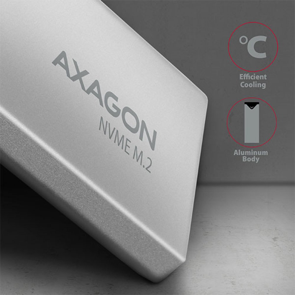 Axagon stříbrná NVMe M.2 SSD externí box 1x USB-C 3.2 Gen 2 M.2 1.1 cm 3.9 cm 11.5 cm 43g hliník s plastovými částmi