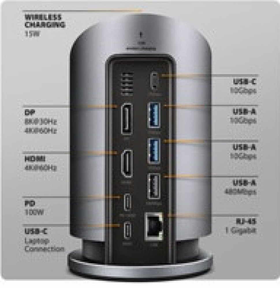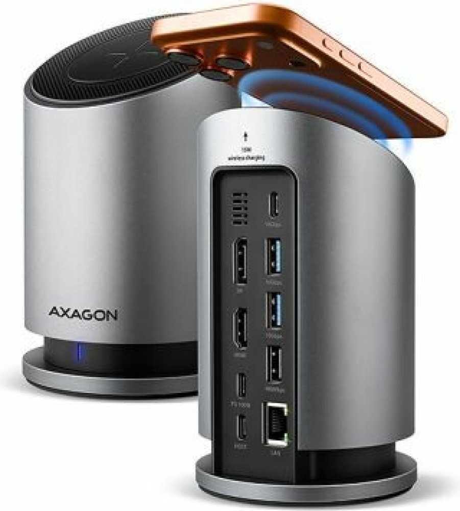 Multiportový USB-C 10Gbps AXAGON HMC-WL9 WIRELESS CHARGING 9in1 hub rozšíří váš notebook, počítač nebo telefon o dva video výstupy, LAN konektor, USB porty a bezdrátovou nabíječku. Váš notebook připojíte k hubu přes 60 cm dlouhý USB-C kabel. Okamžitě tak máte k dispozici připojení pro dva 4K monitory, čtyři USB zařízení a konektor RJ-45 pro Gigabitovou Ethernet síť. Zároveň získáte možnost napájení notebooku pomocí technologie Power Delivery. Díky kompatibilitě s rozhraním Thunderbolt 3/4/5 můžete dokovací stanici 9v1 použít i s notebooky, jako jsou například Apple MacBook Air nebo MacBook Pro. Bezdrátové nabíjení pro mobilní telefony s výkonem až 15 W je integrováno přímo do těla hubu. Díky magnetickému systému uchycení stačí telefon jednoduše přiložit - automaticky se vyrovná do optimální pozice. Nabíjení je tak maximálně efektivní, bezpečné a pohodlné. Samozřejmostí je kompatibilita se standardy Qi1, Qi2 a MagSafe. Pro dosažení maximálního výkonu bezdrátového nabíjení je nutné po...