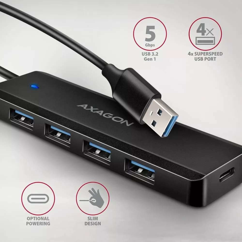 Cestovní USB-A 5Gbps hub AXAGON HUE-C1A snadno a rychle připojí k notebooku nebo počítači až čtyři USB zařízení současně. Napevno uchycený USB-A kabel délky 19 cm je ideální pro uživatele mobilních zařízení. Standard USB 3.2 Gen 1 umožní přenosovou rychlost až 5Gb/s.