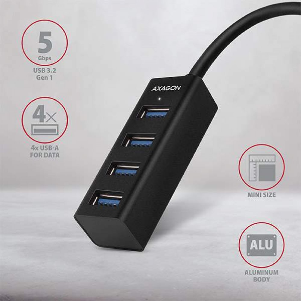 Miniaturní kovový USB 3.2 Gen 1 (USB 3.0) hub AXAGON HUE-M1A snadno a rychle připojí k notebooku nebo počítači až čtyři USB zařízení současně. Kovové tělo hubu je vyrobeno z hliníku a zajišťuje tak dokonalou mechanickou ochranu pro časté přenášení. Elegantní, jemně strukturovaný povrch brání nežádoucím otiskům. Gumové nožky zabraňují klouzání hubu po stole. Napevno uchycený USB kabel délky 20 cm j...