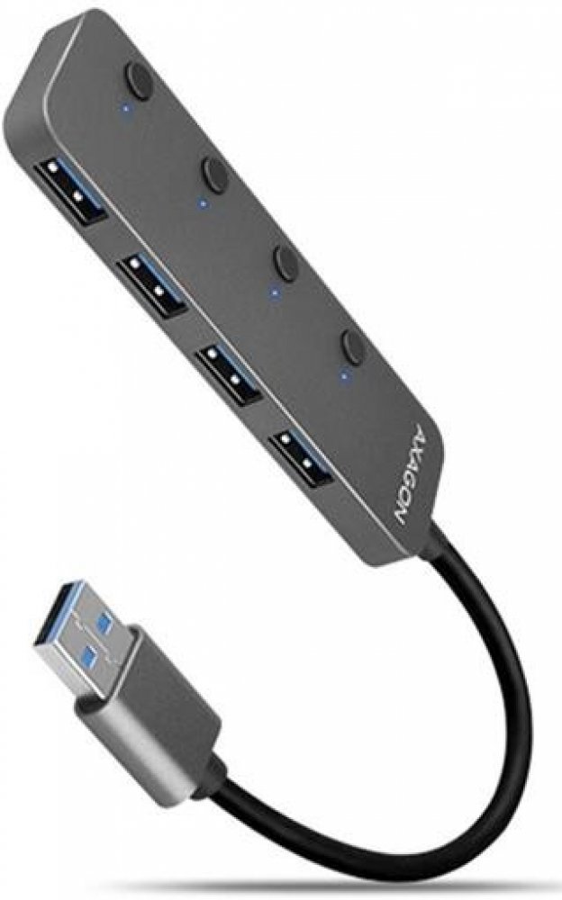Každý USB port lze vypnout / zapnout pomocí tlačítka. Lze tak snadno odpojovat nepotřebná zařízení bez nutnosti jejich odpojování z USB hubu. Každý USB-A port má modrou LED indikaci zapnutí / vypnutí portu. Po zapojení hubu všechny LED svítí = porty jsou zapnuté, LED nesvítí = port je vypnutý.