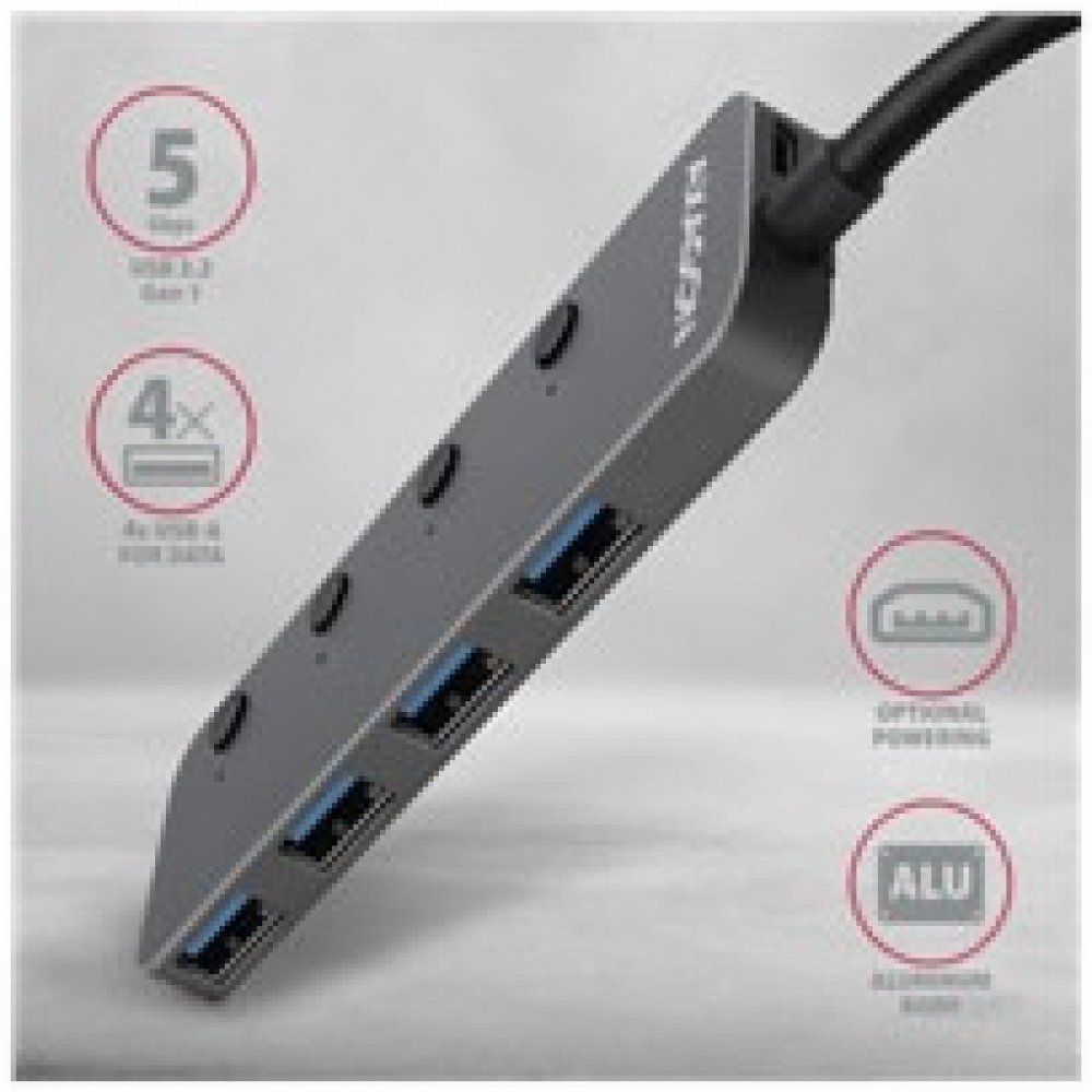 Všestrannost tohoto USB hubu zvyšuje také vestavěný micro USB konektor pro dodatečné napájení ze standardních USB nabíječek dodávaných k mobilním telefonům. Díky tomuto přídavnému napájení lze například připojit několik externích disků k počítači, notebooku, tabletu nebo smartphonu. Standard USB 3.2 Gen 1 umožní přenosovou rychlost až 5Gb/s.