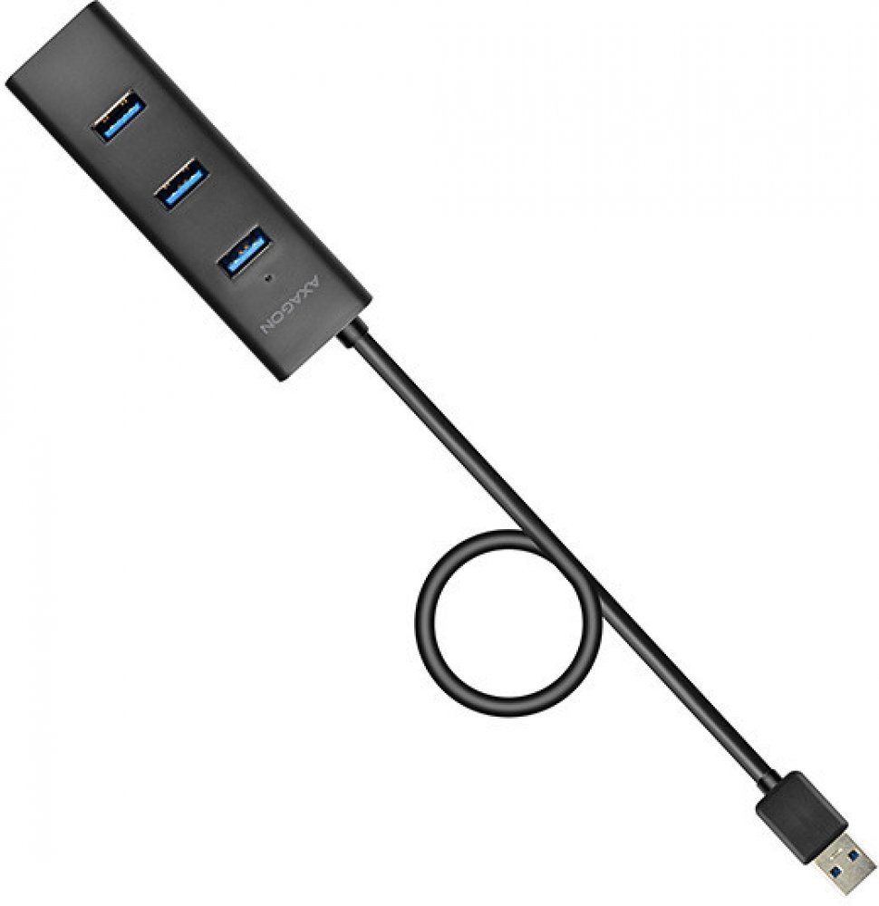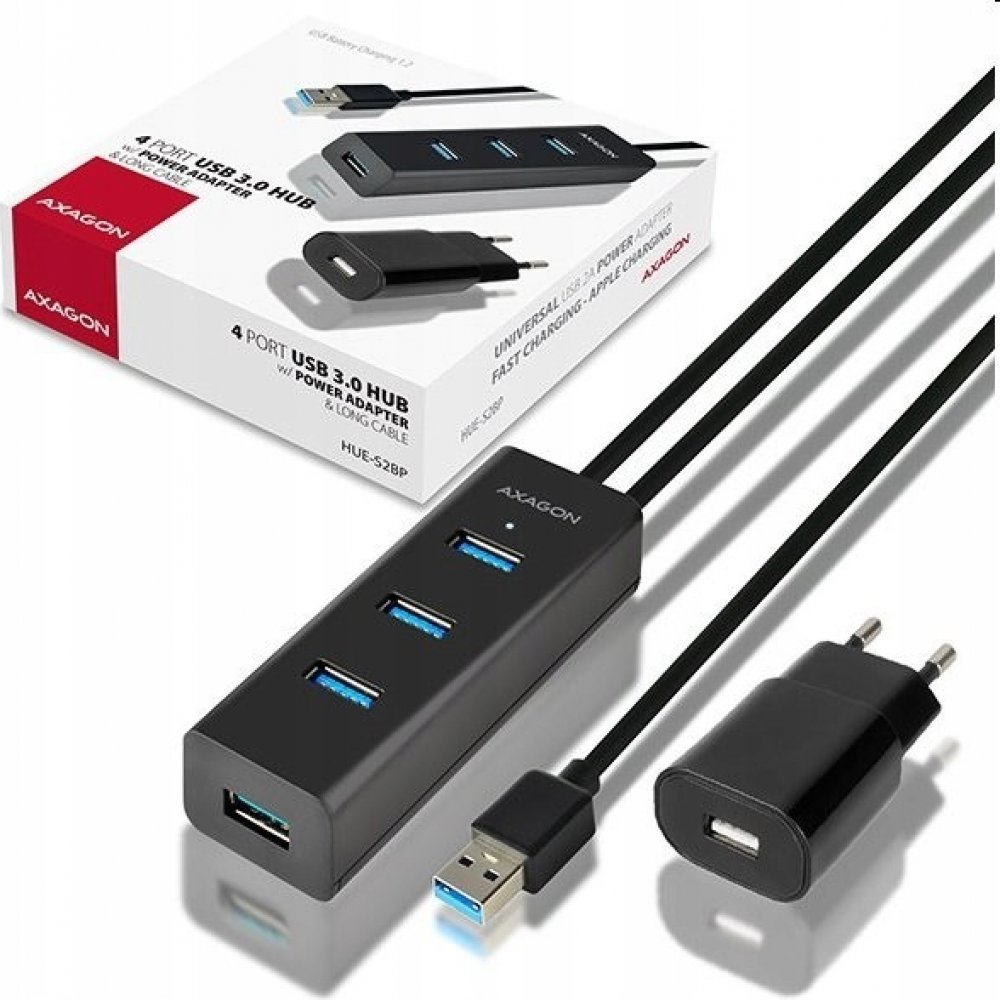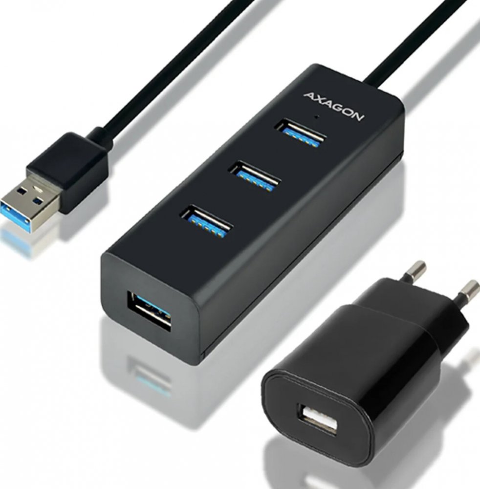 4-portový USB 3.0 hub AXAGON HUE-S2BP s USB kabelem dlouhým 1.2m, napájecím zdrojem a podporou rychlonabíjení na všech portech.