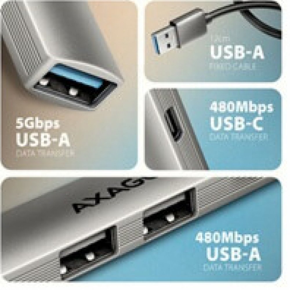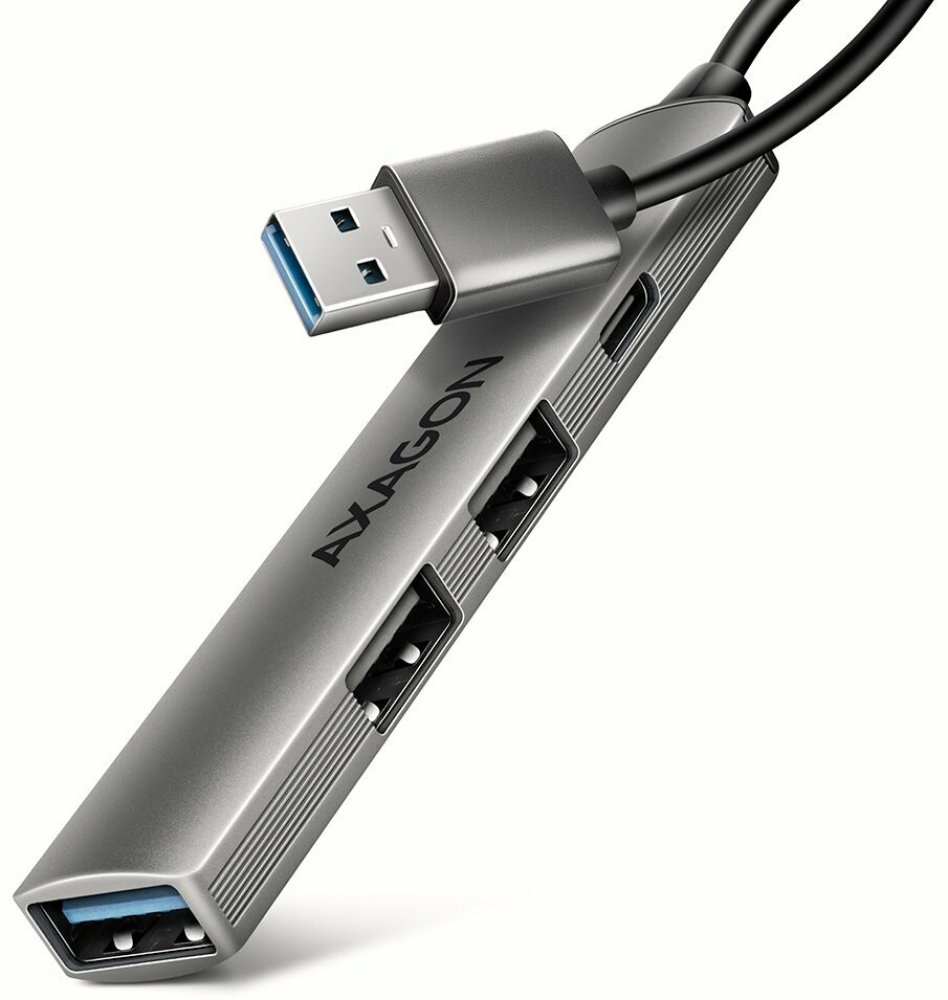 Tenký hliníkový USB-C 5Gbps AXAGON HUE-STC ALU STRIP hub snadno a rychle připojí k notebooku, počítači nebo telefonu až čtyři USB zařízení současně. Váš notebook připojíte k hubu přes 12 cm dlouhý USB-C kabel. USB rozbočovač nabízí čtyři USB výstupy - jeden USB-A 5Gbps, ideální pro rychlé připojení externích disků či flash pamětí. Dva standardní USB-A 480 Mbps výstupy jsou dostačující pro spolehlivé připojení myši, klávesnice nebo tiskárny. Čtvrtý USB-C 480Mbps datový konektor umožňuje připojení většiny mobilních telefonů a dalších zařízení s běžnou přenosovou rychlostí. Štíhlé hliníkové tělo nejen skvěle vypadá, ale zároveň poskytuje mechanickou odolnost a pasivní chlazení. USB-C hub je ideálním doplňkem pro notebooky s omezeným počtem USB-A konektorů, díky čemuž můžete nadále využívat své stávající periferie bez nutnosti pořizovat nové. Funkce Plug & Play a Hot Plug zajišťují snadné zapojení bez složité instalace a umožňují pohodlné připojování i odpojování zařízení za chodu počítače. Hub si poradí i s trvalým připojením několika externích disků. Rozbočovač bez problému zvládne připojení k telefonům a tabletům s USB-C konektorem. K telefonu tak můžete připojit například flash disk, externí disk klávesnici nebo myš. Vstup (připojení k počítači, tabletu nebo telefonu): • USB 5Gbps (USB 3.2 Gen 1), konektor USB-C male. • Kompatibilní s USB 480Mbps, USB 10Gbps, USB 20Gbps, USB 40Gbps, Thunderbolt 3/4/5. Výstupy USB: • 1x USB 5Gbps port, konektor USB-A female. • 2x USB 480Mbps port, konektor USB-A female. • 1x USB 480Mbps port, konektor USB-C female. • USB-C hub zvládne připojení několika externích disků současně. • Nabíjení mobilních zařízení (včetně iPad) z USB-A a USB-C portů hubu. Další vlastnosti: • Možnost připojení zařízení za chodu díky podpoře Hot Plug. • Plná podpora Plug and Play. • Podpora úsporného režimu. • Napájení prostřednictvím USB sběrnice - USB bus power. • Kvalitní stíněný kabel zaručuje vysokou rychlost komunikace a minimální nežádoucí interference. • Rozměry: 88 × 17 × 9 mm (Š × H × V). • Hmotnost 22 g (vč. kabelu). • USB-C kabel délky 12 cm pro připojení hubu k notebooku. Podporované operační systémy: • Windows 10 / 11, macOS, iPadOS, iOS, Linux, Chrome OS a Android. • Kompatibilita je závislá na používaném operačním systému a podpoře od výrobce zařízení. Balení v kartonové krabičce s otvorem pro zavěšení obsahuje: • USB-C hub s kabelem napevno délky 12 cm, • vícejazyčný návod CZ/DE/DK/ENG/ESP/EST/FIN/FR/GR/HR/HU/IT/LT/LV/NL/NOR/PL/PT/RO/SK/SLO/SRB/SWE/TR/UA/ALB/BG/BOS/CN/ARA..