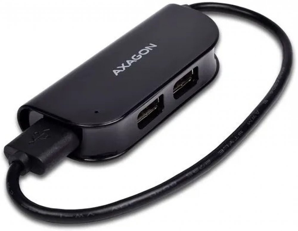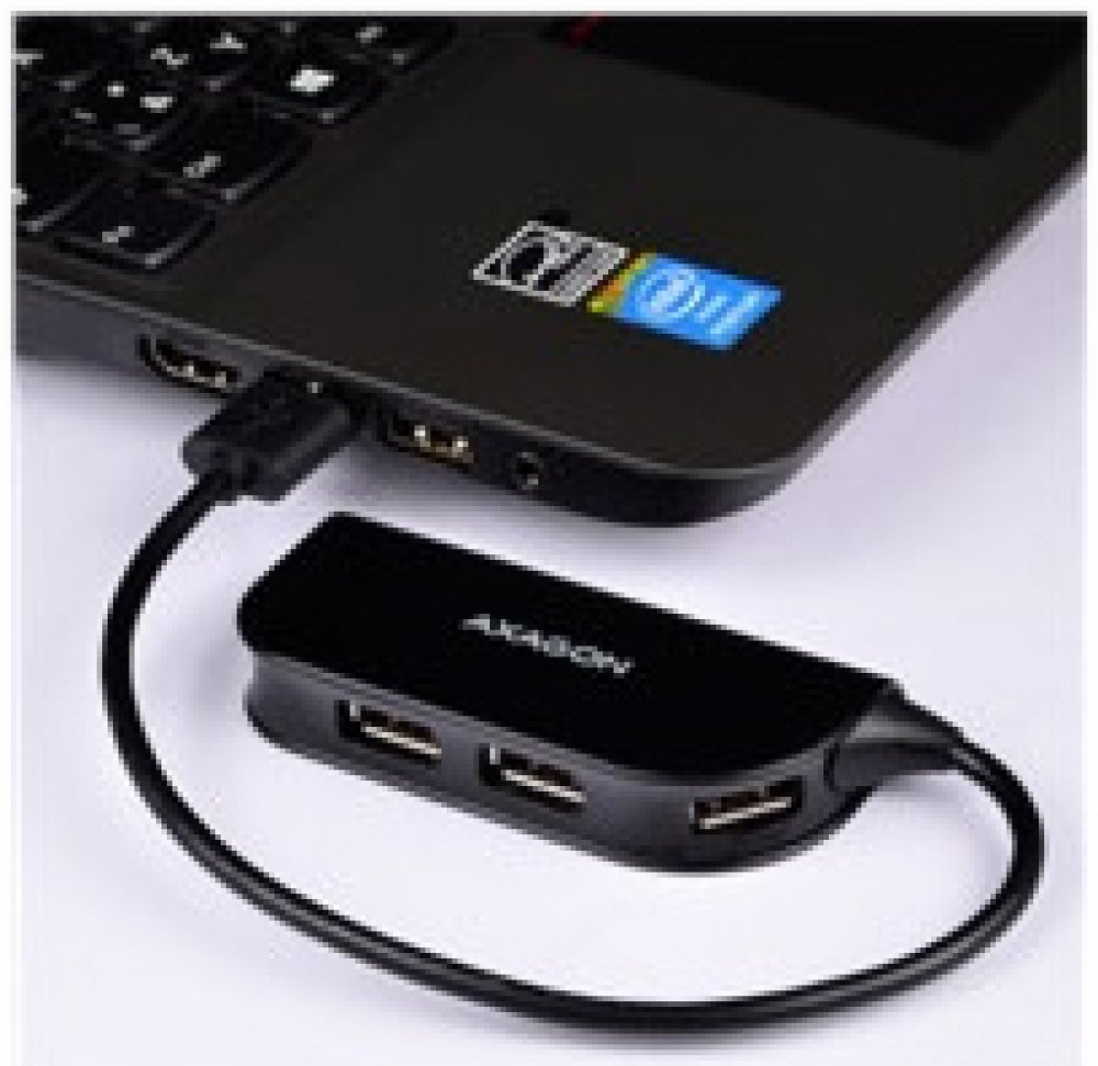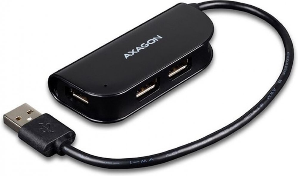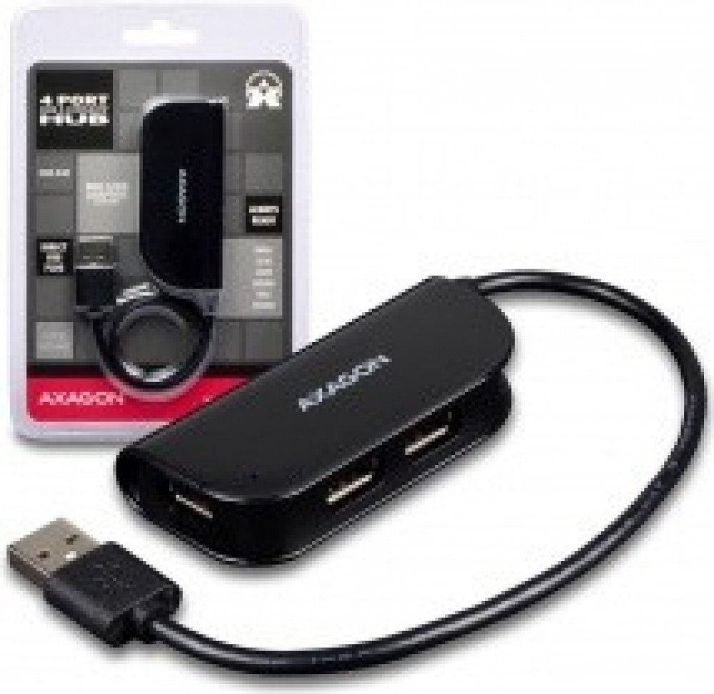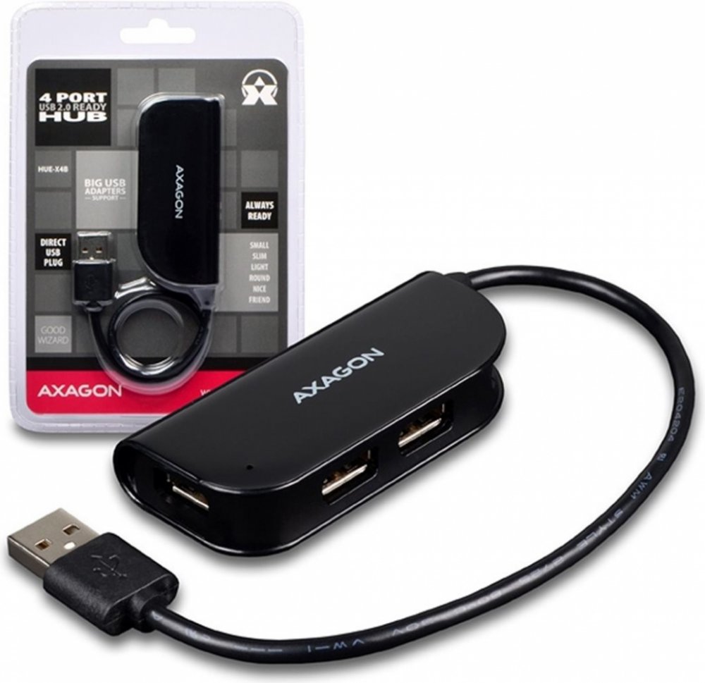 Čtyřportový USB 2.0 READY hub AXAGO HUE-X4B s napevno uchyceným USB kabelem.