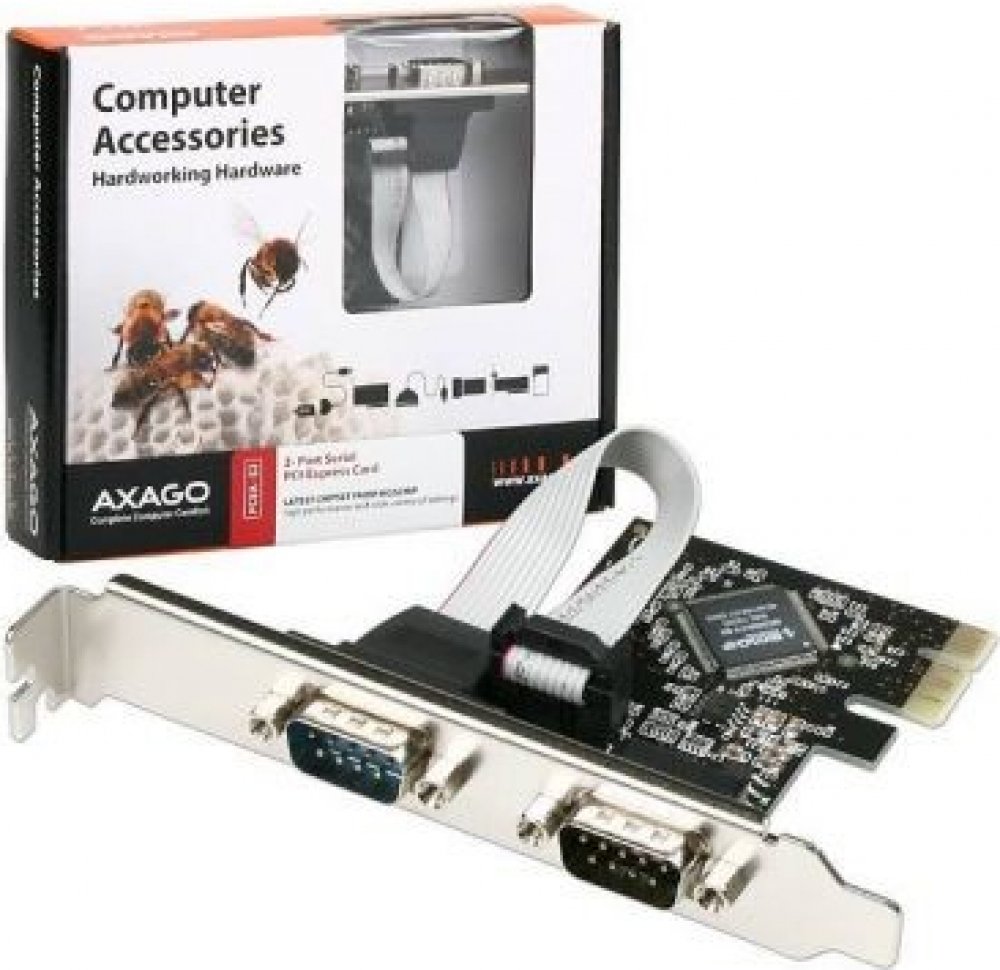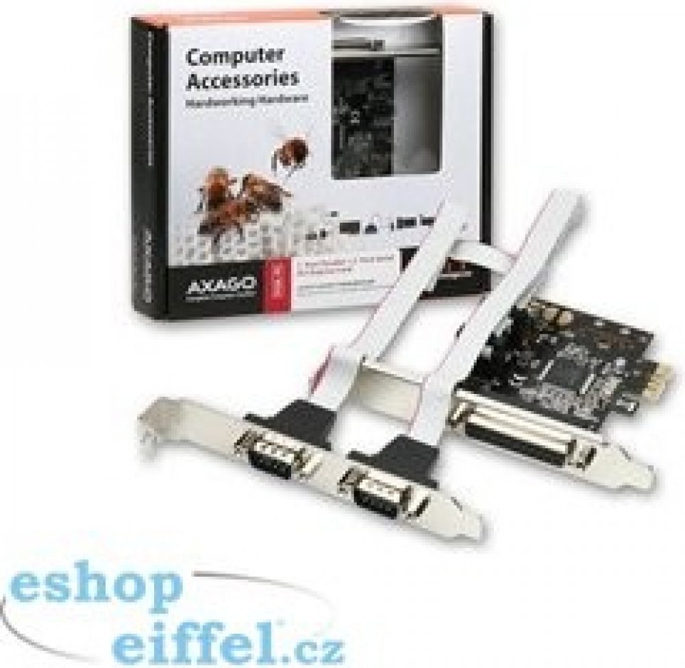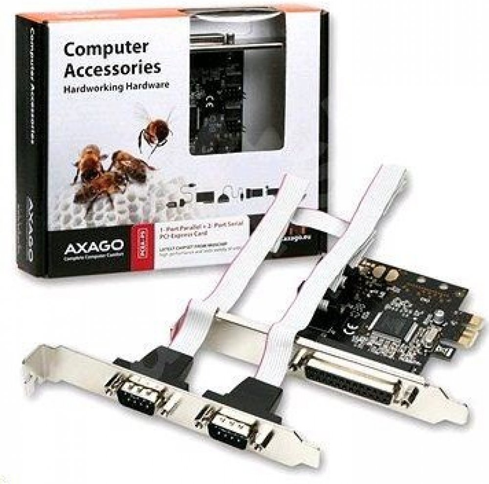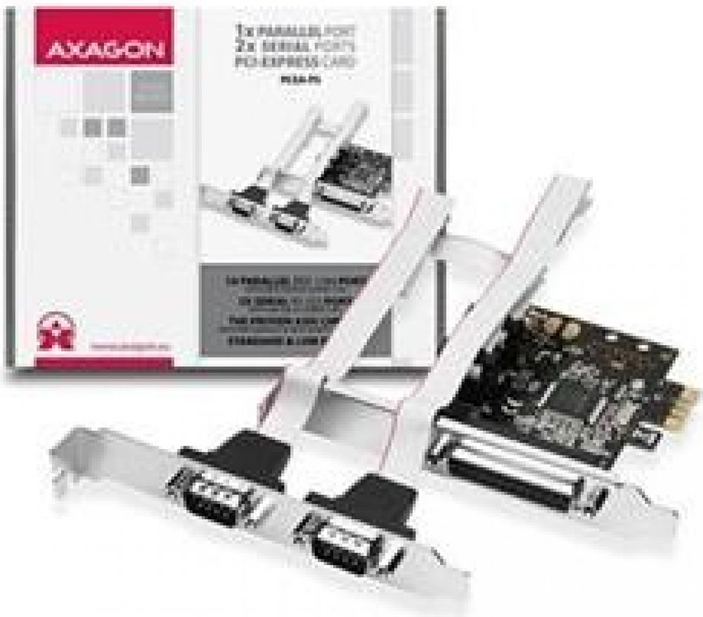 PCI-Express karta AXAGON PCEA-PS rozšíří stolní počítač o jeden paralelní port s DB25 konektorem na desce a dva sériové porty standardu RS-232 s DB-9 konektory na druhé záslepce.
