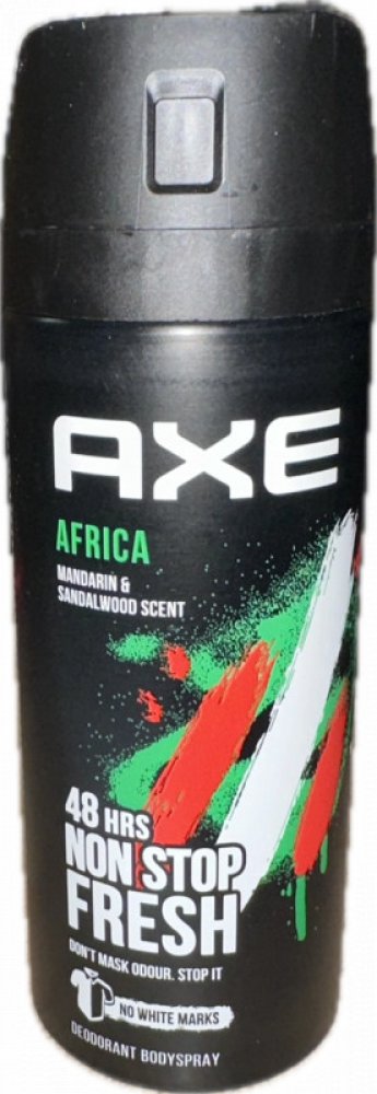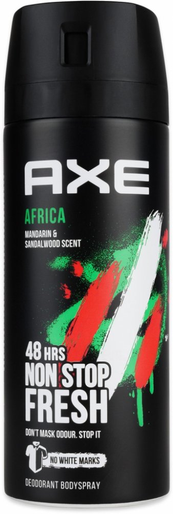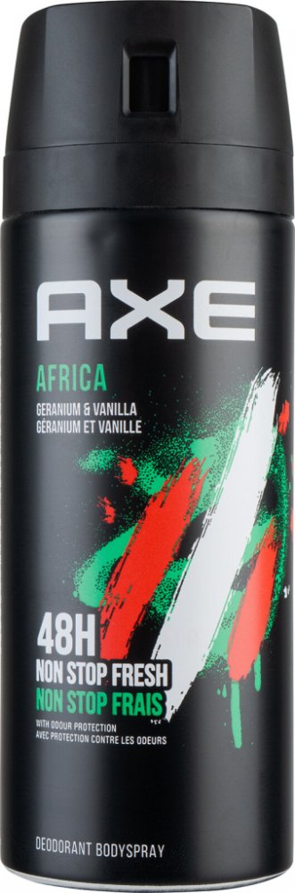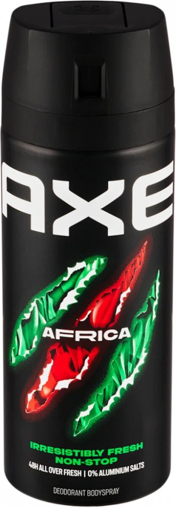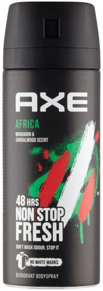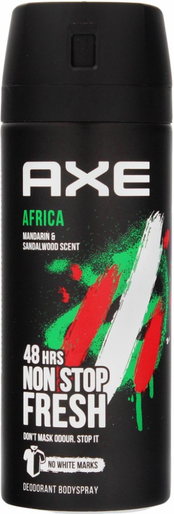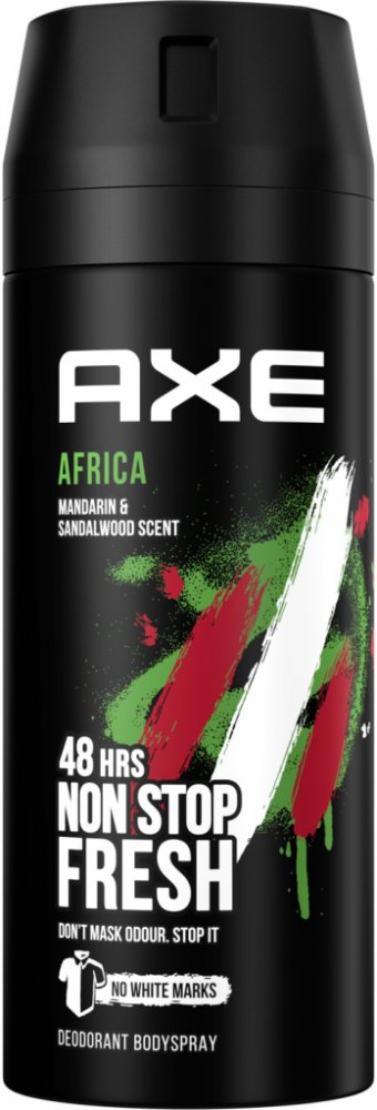 Axe Africa probudí tvé divoké instinkty a připraví tě na další exotické dobrodružství. Tato vůně s citrusovo jantarovým aroma je vzrušující jako expedice na Saharu. Prostě vůně, která udělá šelmu z každého muže. Vhodný pro všechny typy pokožky. AXE Africa deodorant ve spreji poskytuje pokožce dlouhodobou ochranu před pocením a zápachem.