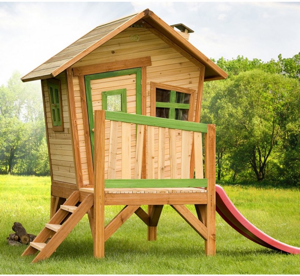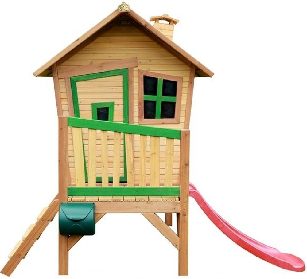 Dětský domeček na kůlech se schodištěm, verandou a malou červenou skluzavkou