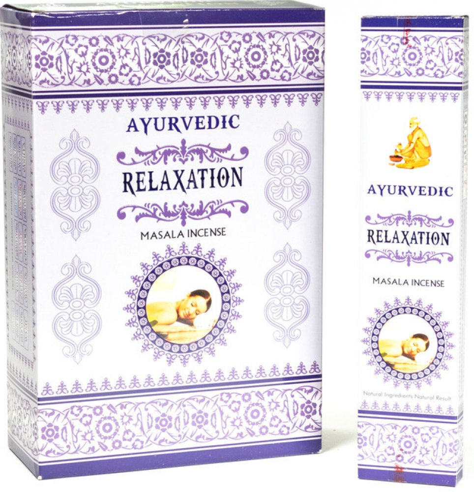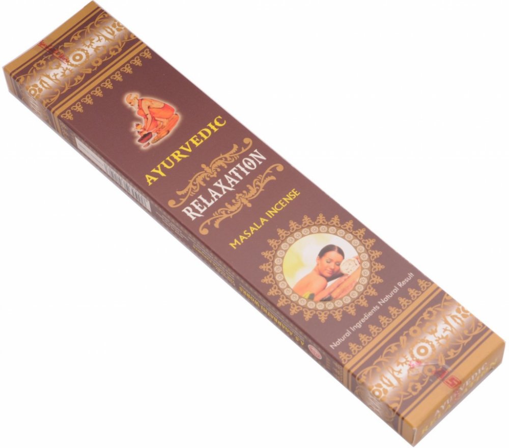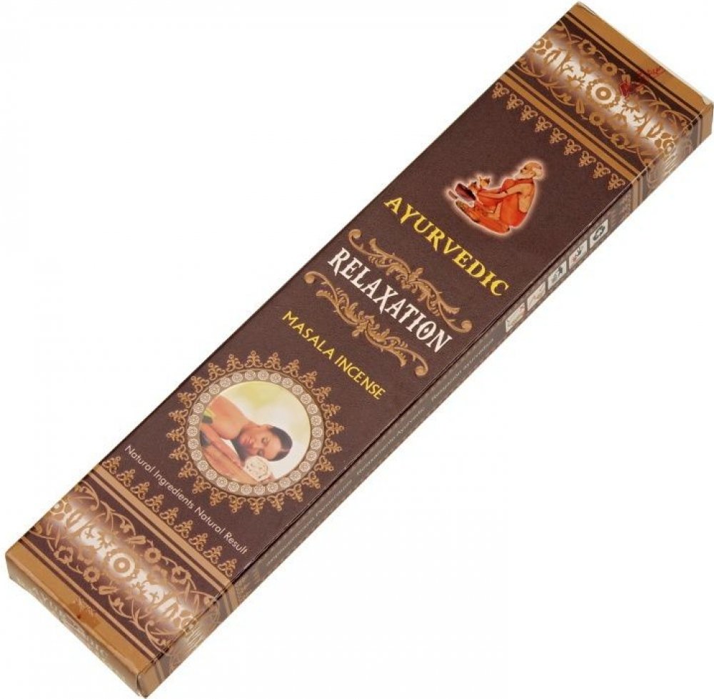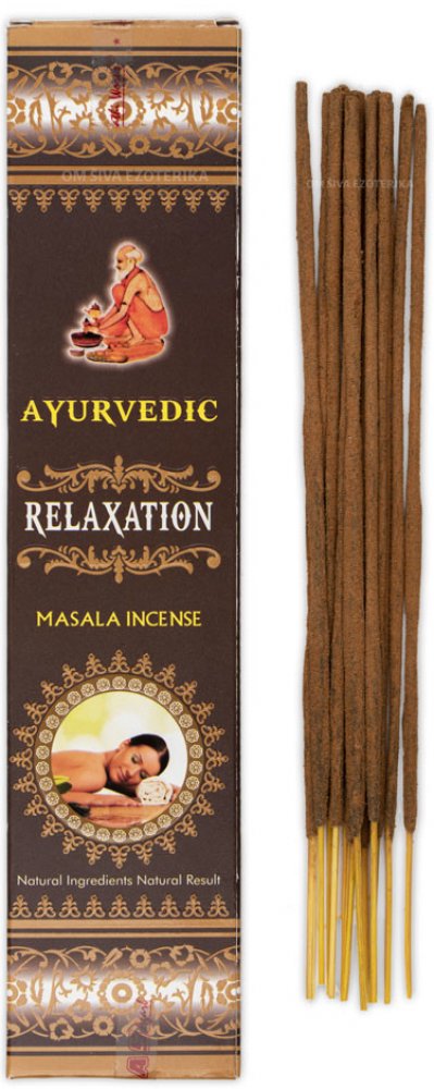 Vonné tyčinky Ayurvedic Relaxation jsou vyrobeny z aromatických květů, bylin a koření, vonných olejů, medu, aromatických dřev a dalších příměsí narolovaných na bambusové štěpině.