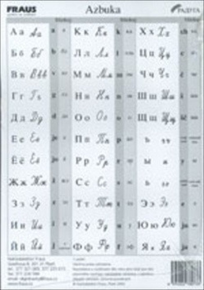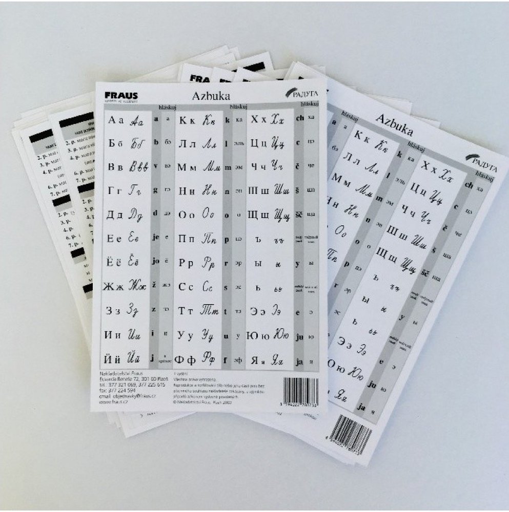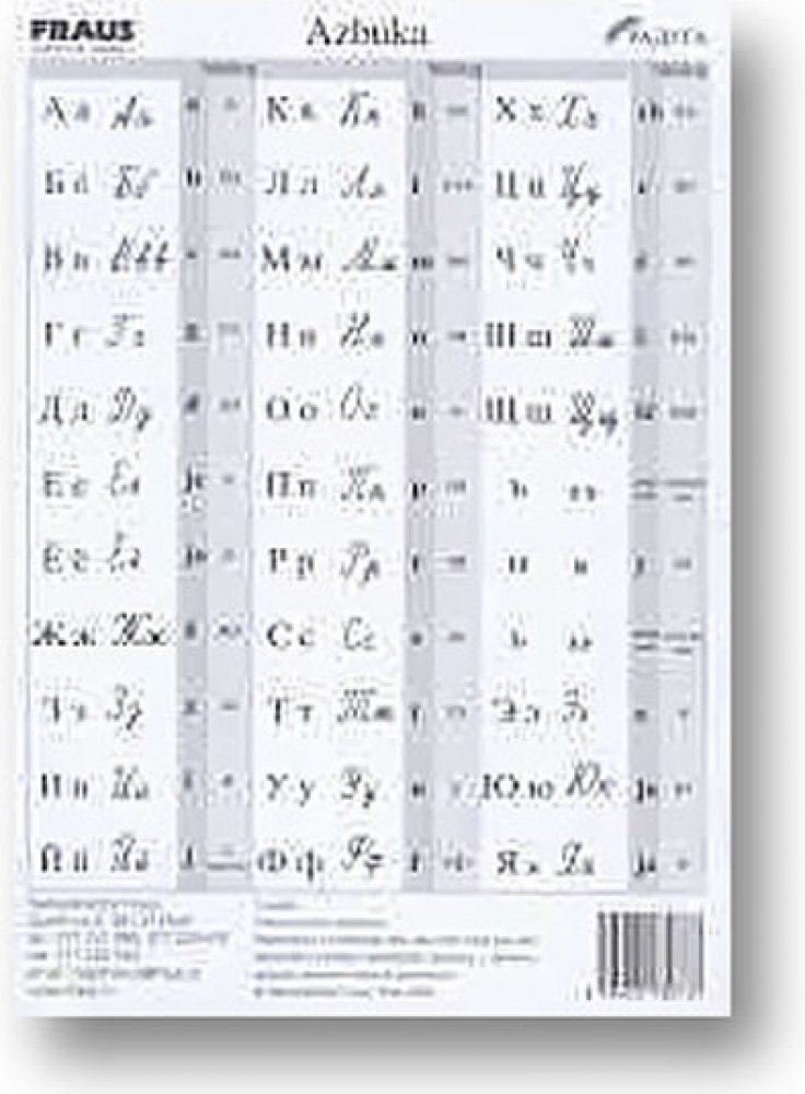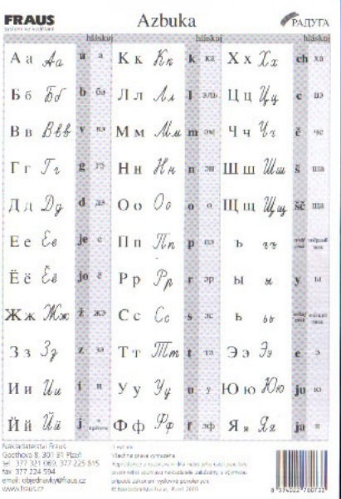 zobrazuje tištěnou a psanou formu písmen azbuky, druhá strana