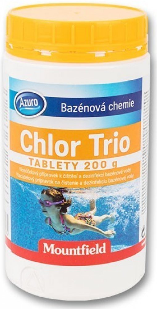 Víceúčelový přípravek k desinfekci, zabránění vzniku řas a flokulaci. Přípravek Azuro Chlor Trio působí nejen jako dezinfekční, protiporostový a antimikrobiální prostředek ale také jako algicidní a vločkovací prostředek. Po ponoření tablety do vody dochází k postupnému uvolňování chloru (dezinfekci a oxidaci organického znečištění bazénové vody) a zároveň k rozpouštění látky s algicidním účinkem (...