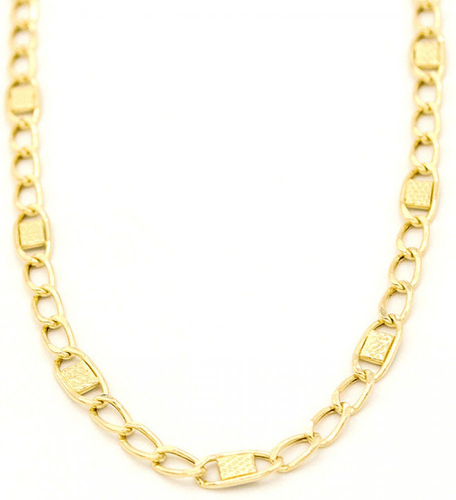 Unisex zlatý řetízek Figaro se zdobením v delší délce ze žlutého zlata.Extravagantní řetízek žluté zlato typ Figaro, zdobený mřížkovaným gravírováním na článcích s kvalitním zapínáním na karabinu.Rozměry: šířka řetízku 3,5mm.585/1000 Au 14karátů.Šperk označen platnou puncovní značkou.