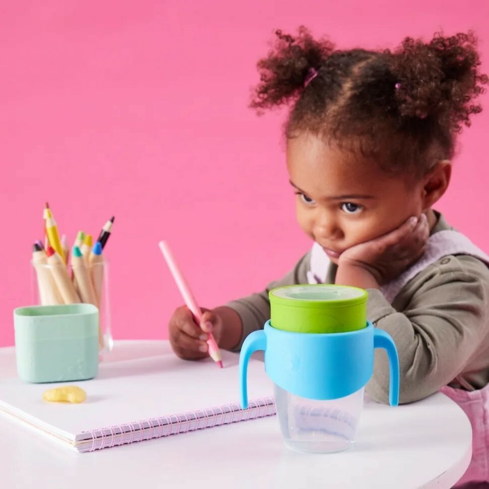 360° netekoucí učící hrneček od značky b.box dovoluje dětem nápoj z hrnečku jen usrkávat, ale hlavně učit se pít díky unikátnímu měkkému silikonovému okraji po celém okraji hrnečku.