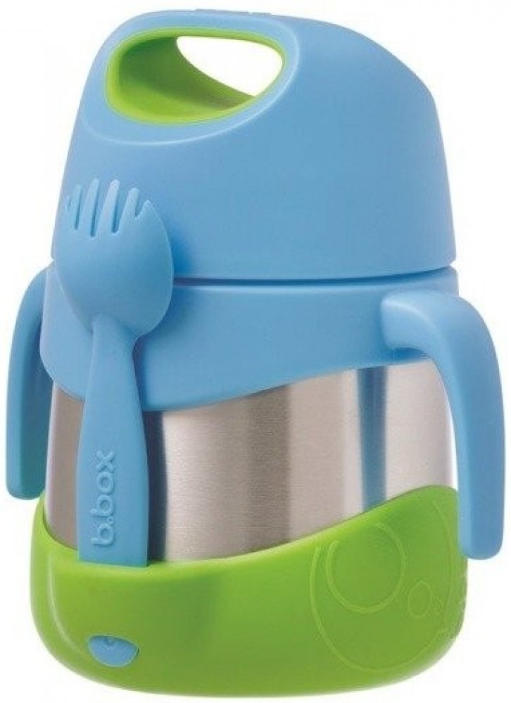 na polévku i na svačinku. S vidli-lžičkou :-)Dvouplášťová široká termoska, aby malé ručičky dosáhly na poslední sousto na dně. Na víčku je "ouško", za které je možné termosku nosit nebo zavěsit na karabinu. Kromě toho je toto "ouško" skvělé i pro slabé nebo malé ruce - vložením prstů do otvoru a pootočením lze využít "páky" a tak je otevření snadné jak pro děti, tak i pro starší lidi. Ucha po stranách termosky i kryt chránící dno termosky z venku jsou odnímatelné. Termoska je vhodná pro děti od 6 měsíců, ale hodí se i pro velké děti a rodiče, díly odnímatelným "ouškům" a dolnímu krytu. Šroubovací víčkoOdnímatelná uchaVidličko-lžičkaOdnímatelný dolní kryt Lze mýt v horním koši myčky Termoska udrží jídlo teplé až 5 hodin a studené až 7 hodin. Vždy zkontrolujte teplotu potravin před podáním dítěti! Tip: Před naplnění termosky teplým jídlem, nalijte do termosky na dvě minuty horkou vodu a nechte termosku prohřát. Pokud naopak chcete udržet jídlo déle studené, můžete vychladit kostkami ledu. K termosce je možné dokoupit náhradní vidličko-lžičku. Objem: 335 mlVáha: 380gMateriál: nerezová ocel, ucha, víčko a vidlička jsou z PP, spodní kryt z PP/TPE Údržba: Doporučujeme mýt v ruce jemným prostředkem na mytí nádobí. Nepoužívejte abrazivní mycí prostředky, houbičky či drátěnky, které mohou produkt poškrábat. Lze mýt v myčce v horním koši.UPOZORNĚNÍ: Nepoužívejte s kyselými tekutinami či potravinami, může dojít ke korozi.Některé potraviny mohou způsobit zabarvení produktu. Toto nemá vliv na funkčnost produktu a není důvodem k reklamaci. Neponechávejte dítě bez dozoru dospělé osoby. Vždy zkontrolujte teplotu pokrmu před podáním dítěti. Termosku nikdy nedávejte do mikrovlnné trouby! Informace jak pečovat o produkty b.box naleznete zde.