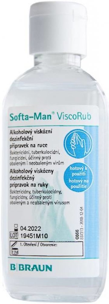 Softa-Man® ViscoRub je jedním z nejmodernějších přípravků k okamžitému použití pro dezinfekci rukou kdykoliv a kdekoliv je to potřeba. Jako součást rutinní hygieny rukou, ať už pro hygienickou nebo chirurgickou dezinfekci, ale i tam, kde není k dispozici voda a mýdlo. Softa-Man® ViscoRub jedinečným způsobem spojuje vlastnosti alkoholového dezinfekčního prostředku s kosmetickými vlastnostmi, čímž se stává přípravkem první volby pro hygienu rukou. Klíčové výhody Široké spektrum účinnosti Baktericidní (včetně MRSA), fungicidní, tuberkulocidní, mykobaktericidní, účinný proti obaleným virům a rotavirům Testován dle norem EN 14476/DVV/RKI Obsahuje speciálně vybrané dermatologické přísady, má hydratační a zvláčňující účinky Hypoalergenní složení Dermatologicky testován Bez obsahu parfémů a barviv, snižuje riziko podráždění Vyrobený ve Švýcarsku Návod k použití | Chirurgická dezinfekce rukou 2-3 ml neředěného přípravku Softa-Man® ViscoRub naneste na suché ruce a předloktí a vtírejte. Proveďte stejný postup minimálně 3x. Dbejte na to, aby ruce a předloktí byly po celou doporučenou dobu vlhké. Poté nechte dokonale zaschnout. Doporučujeme expozici dle EN 12791 pro chirurgickou dezinfekci rukou 90 s. Návod k použití | Hygienická dezinfekce rukou | Minimálně 3 ml neředěného přípravku Softa-Man® ViscoRub naneste na suché ruce a důkladně vtírejte do zaschnutí. Ruce udržujte celé zvlhčené přípravkem minimálně 20 sec. Jak si správně dezinfikovat ruce? | Návod ke stažení v PDF Složení: 100ml přípravku obsahuje: ethanol 45 g, 1-propanol 18 g. Obsahuje glycerin, Isopropylmyristát, Bisabolol a pomocné látky Distributor: B. Braun Medical s.r.o., V Parku 2335/20, CZ-148 00 Praha 4