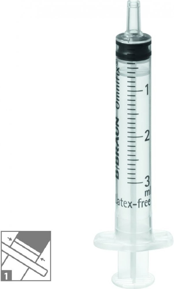 OMNIFIX, 3 ml, LUER (100 ks): 3-dílné injekční stříkačky s Luer kónusem, vysoce průhledným válcem a pístem. Minimální zbytkový objem. Koncovka pístu s dvojitým těsnicím kroužkem. Bez latexu a PVC.