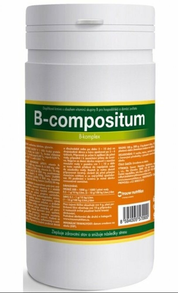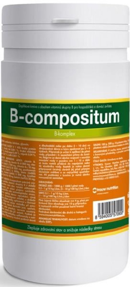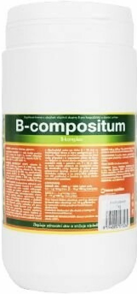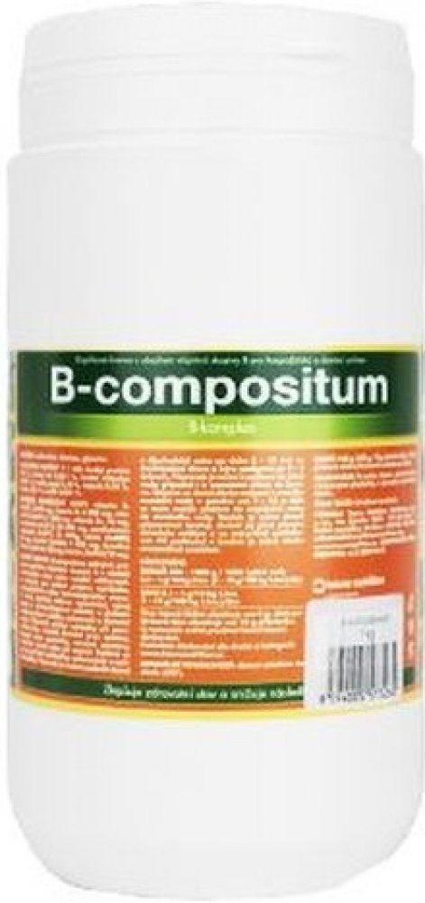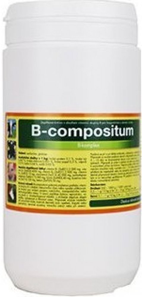 Vitamin B1, Vitamin B2, Vitamin B6, Vitamin B12, Niacinamid, Pantotenan vápenatý, Biotin, Inositol. Krmný návod: Doplňkové krmivo B-compositum se používá při výskytu poruch vyplývajících z nedostatku vitaminů skupiny B, poruchy kůže, opeření a srsti, nervové soustavy, při anémii, perosis, při zátěži vznikající v období intenzivního růstu, vysoké užitkovosti i jiném stresu. Velmi vhodné je jeho používání u zvířat v reprodukci ( zlepšení reprodukčních schopností zvířat, snížení embryonální úmrtnosti, dále pro dobrý vývoj plodu a zlepšení následné životaschopnosti mláďat ), u drůbeže ve snášce, u mláďat, v rekonvalescenci, po léčbě antibiotiky, sulfonamidy a antikokcidiky.