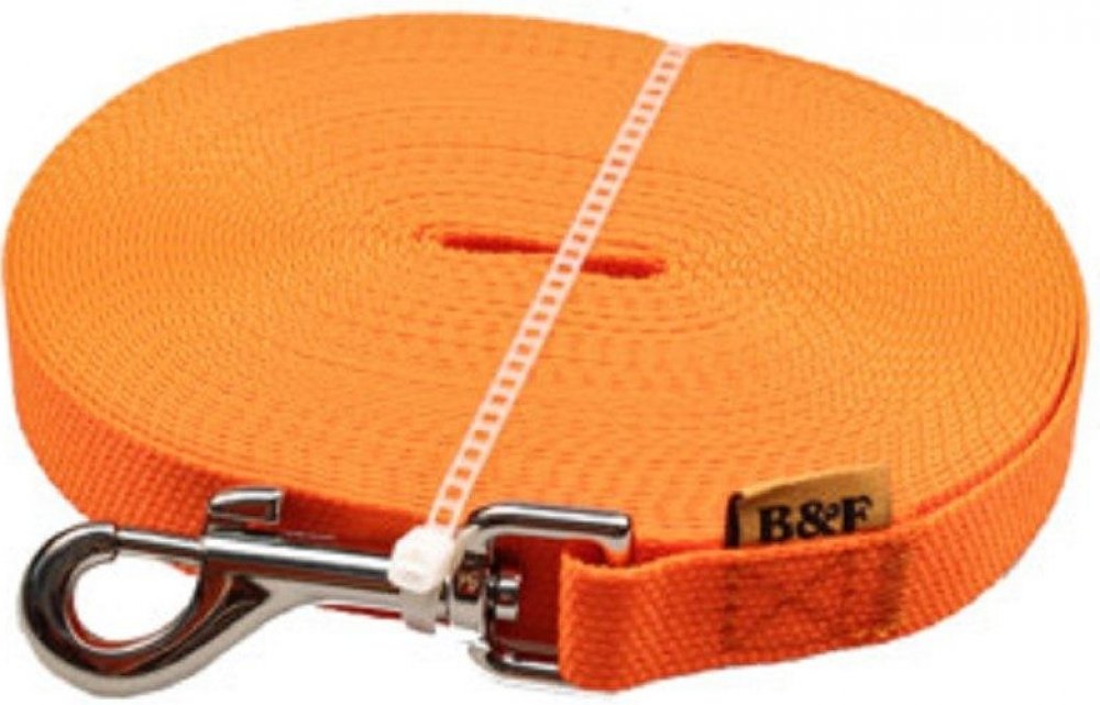 Stopovací vodítko pro psy. Stopovací šňůra je vyrobena z pevného popruhu. Karabina je připevněna kůží a nýty. Šňůru můžete použít buď k výcviku - obrana, poslušnost či k venčení, pokud se bojíte svého mazlíčka pustit, umožníte mu trochu volnosti. !Vodítko není ukončené uchem! Délka 10m Šířka pásku: 2cmBarva: oranžová