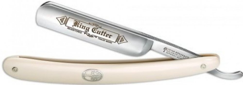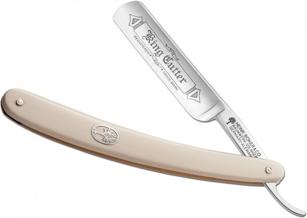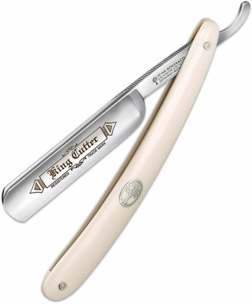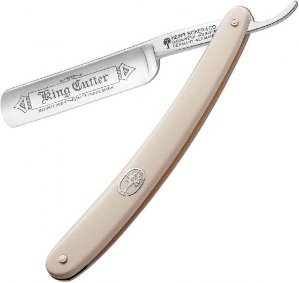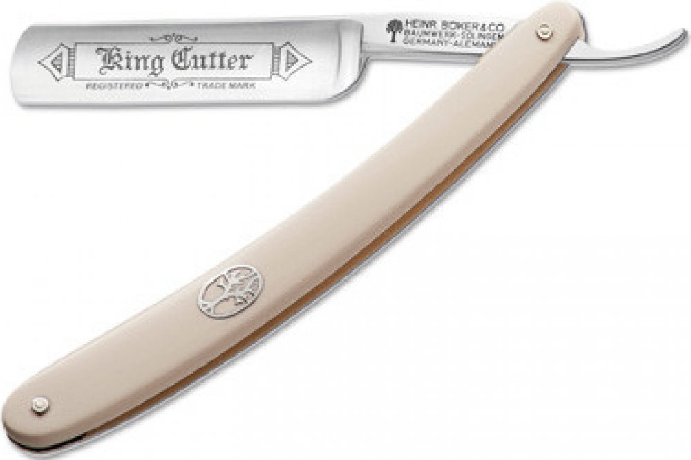 Bílá holicí břitva / strojek Böker Manufaktur Solingen King Cutter White 140624 je pevnou součástí sortimentu Böker od počátku 20. století. Vhodná i pro začátečníky. S čepelí s plně dutým výbrusem z uhlíkové oceli s oblou hlavou o šířce 5/8 palců. Na čepeli je logo King Cutter. Rukojeť je z bílého akrylu, s klasickým vygravírovaným symbolem stromu z niklového stříbra. Dodává se v dárkovém pouzdře, s certifikátem pravosti.