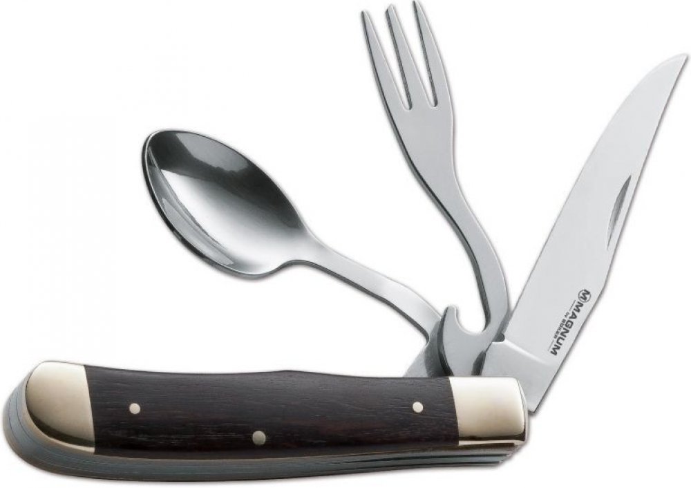 Kapesní zavírací nůž s vidličkou a lžičkou. Rukojeť nože je vyrobena z lepeného dřeva.Čepel je vyrobena z nerez oceli 440.