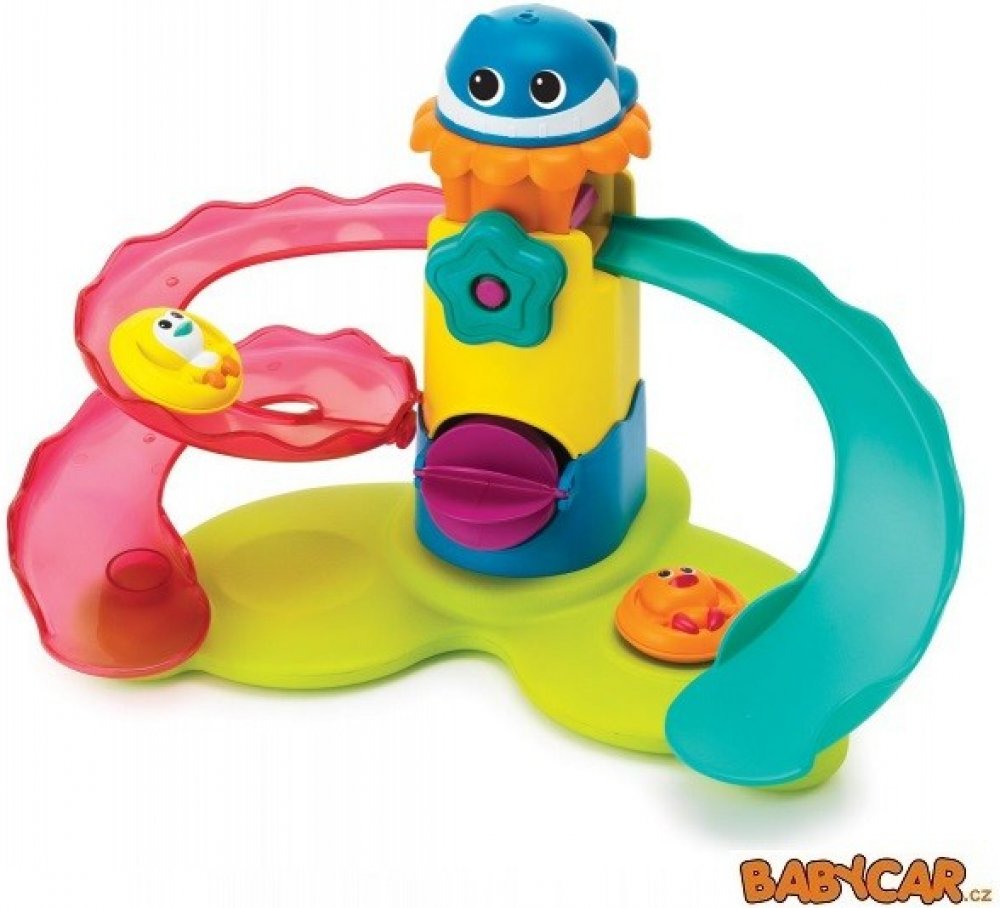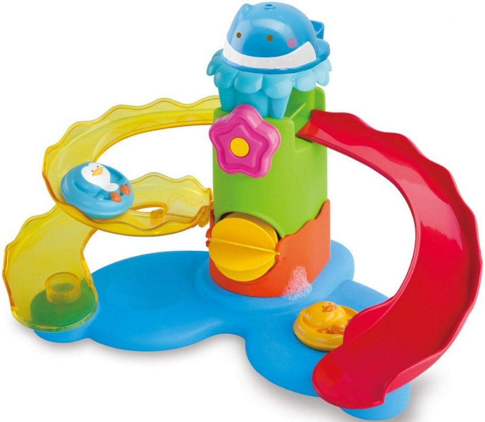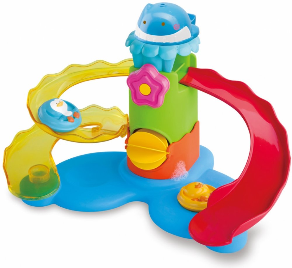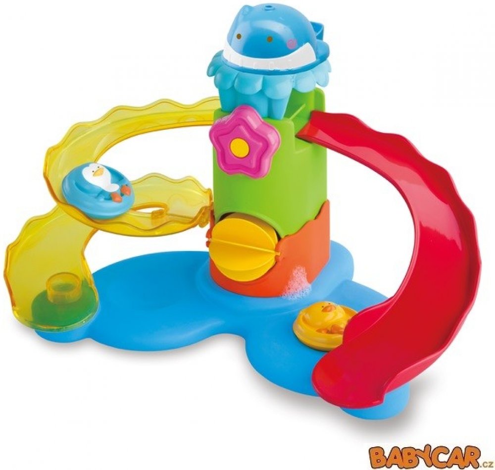 Sadu hraček do koupele tvoří plovoucí tobogan s vodním mlýnkem, kelímek ve tvaru rybičky a kačenka s tučňákem, kteří sviští na toboganu do vody. Hračka zajistí zábavu při koupání a zároveň rozvíjí představivost, smysly i motoriku dítěte. Vhodné od 12 měsíců.