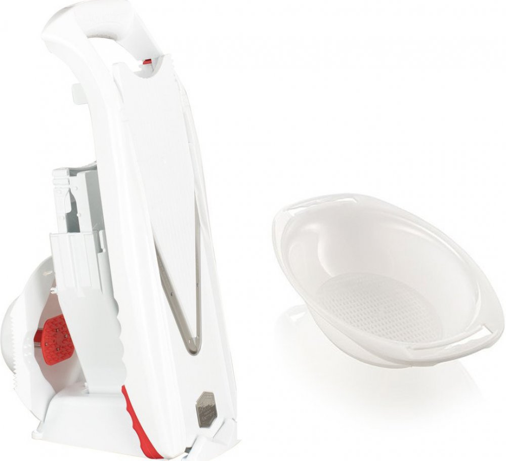 S kráječem Börner V5 PowerLine pracujete ještě rychleji, přesněji a bezpečněji než kdykoliv předtím. Výškově nastavitelné planžety nabízí různé variace krájení. Plátky nakrájíte ve čtyřech různých tloušťkách, nudličky o čtyřech různých silách a kostky ve dvou různých velikostech. Takže máte k dispozici deset různých variant krájení. Součástí balení je i ochranný kloubouček Börner, který Vám umožní bezpečně zpracovat ovoce a zeleninu beze zbytku a současně ochrání Vaše prsty před zraněním patentovanými, ostrými noži. Pro bezpečné a úsporné skladování planžet použijte bezpečnostní zásuvný box. Box umístěný na zadní straně kráječe Börner V5 Power Vám poslouží jako podstavec. V Balení najdete i dokovací stanici. Stanice vytváří ideální místo pro uložení vašeho Börner Vť kráječe. Poskytuje prostor pro kráječ, zásobník s planžetami a ochranný klobouček. Perfektní domov pro váš Börner kráječ a jeho veškeré příslušenství. Miska ke kráječi Original Börner V5 Power - nikde žádný nepořádek! Kráječ nacvaknete na misku a vše do ní padá! Tato originální Borner mísa byla vyvinuta speciálně pro V-Slicer PowerLine a zaručuje perfektní a bezpečné uchycení pro kráječ. Ovoce a zelenina jsou uchyceny v podnosu a saláty jsou připraveny rychlým a snadným způsobem. Přídavné síto slouží jako sítko pro čerstvě umyté listy salátu, ovoce apod. Odolný vůči oleji a ocetům!Snadné ovládání a čištění! Tato sada obsahuje: Börner V5 PowerLine V-kráječ Bezpečnostní planžeta 3,5 mm planžeta 7mm planžeta Zásobník na planžety Dokovací stanice Ochranný klobouček Miska ke kráječi Original Börner V5 PowerLine Všechny použité materiály jsou bezpečné pro potraviny, bez BPA a neobsahují změkčovadla. Vložky pro další možnosti krájení lze objednat samostatně.