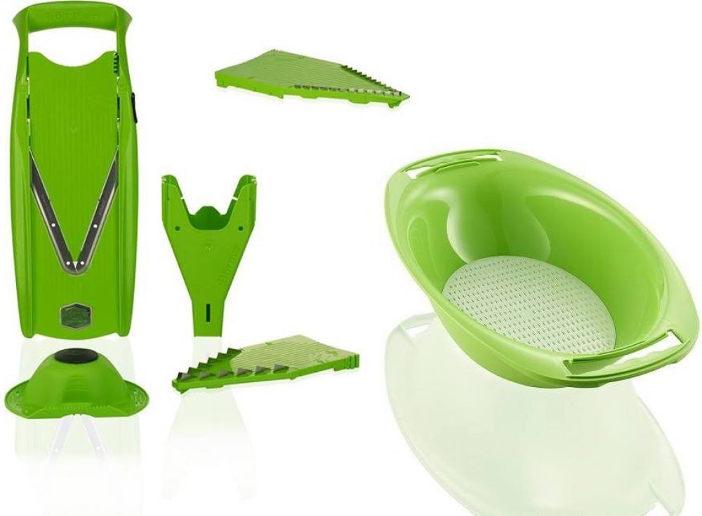 S kráječem Börner V5 PowerLine pracujete ještě rychleji, přesněji a bezpečněji než kdykoliv předtím. Výškově nastavitelné planžety nabízí různé variace krájení. Plátky nakrájíte ve čtyřech různých tloušťkách, nudličky o čtyřech různých silách a kostky ve dvou různých velikostech. Takže máte k dispozici deset různých variant krájení. Součástí balení je i ochranný kloubouček Börner, který Vám umožní bezpečně zpracovat ovoce a zeleninu beze zbytku a současně ochrání Vaše prsty před zraněním patentovanými, ostrými noži. Pro bezpečné a úsporné skladování planžet použijte bezpečnostní zásuvný box. Box umístěný na zadní straně kráječe Börner V5 Power Vám poslouží jako podstavec. Miska ke kráječi Original Börner V5 Power - nikde žádný nepořádek! Kráječ nacvaknete na misku a vše do ní padá! Tato originální Borner mísa byla vyvinuta speciálně pro V-Slicer PowerLine a zaručuje perfektní a bezpečné uchycení pro kráječ. Ovoce a zelenina jsou uchyceny v podnosu a saláty jsou připraveny rychlým a snadným způsobem. Přídavné síto slouží jako sítko pro čerstvě umyté listy salátu, ovoce apod. Odolný vůči oleji a ocetům!Snadné ovládání a čištění! Tato sada obsahuje: Börner V5 PowerLine V-kráječ Bezpečnostní planžeta 3,5 mm planžeta 7mm planžeta Zásobník na planžety Ochranný klobouček Miska ke kráječi Original Börner V5 PowerLine