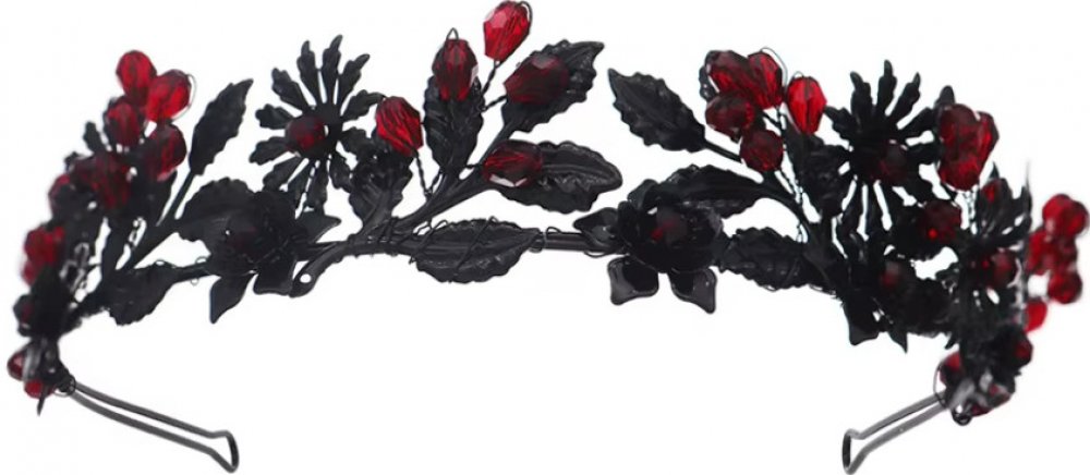 Dramatická korunka do vlasů zdobená černými květy, elegantními lístky a výraznými červenými krystaly. Tento jedinečný design kombinuje temnou eleganci s nádechem luxusu, což z ní činí perfektní doplněk pro večerní nebo slavnostní příležitosti.