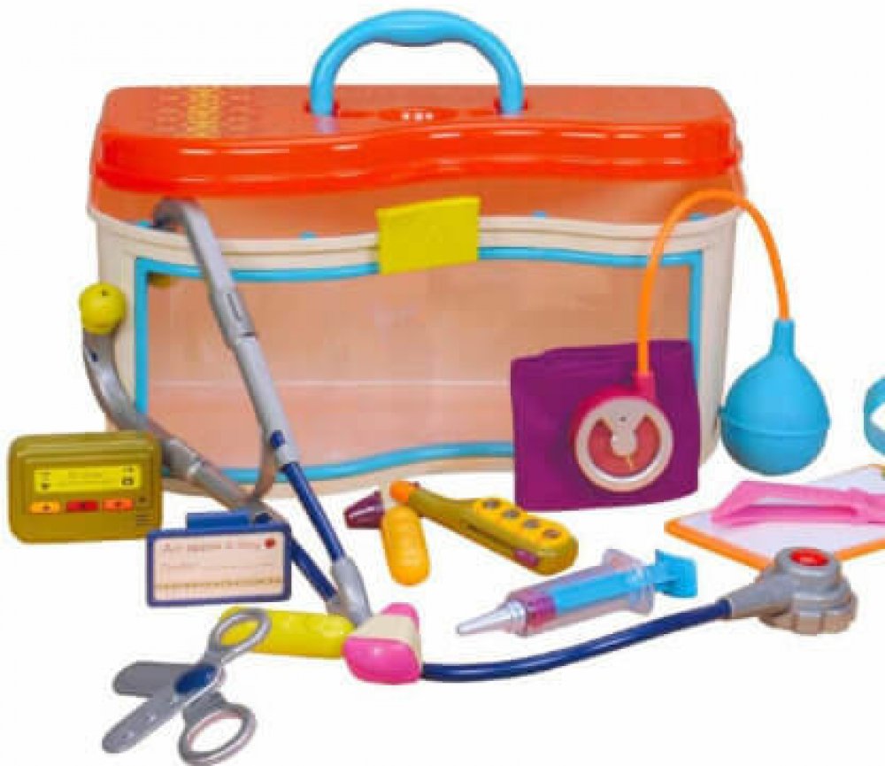 * podložku na psaní s papírem, kladívko, otoskop, teploměr, obvazy, jmenovku, stetoskop se zvukem tlukotu srdce, tlakoměr, pinzetu, stříkačku, bezpečné nůžky a pípátko.