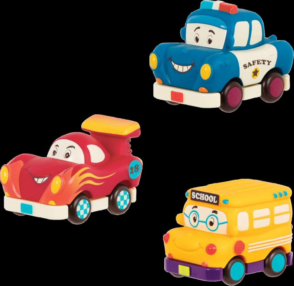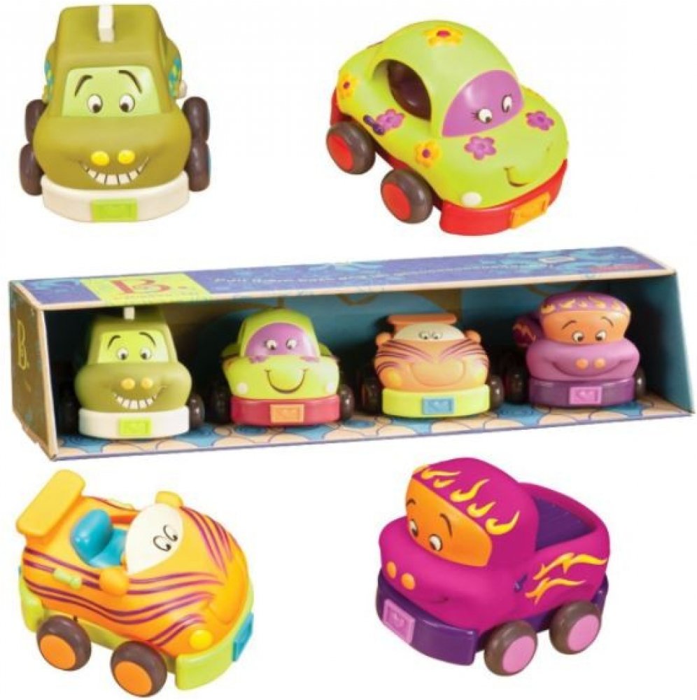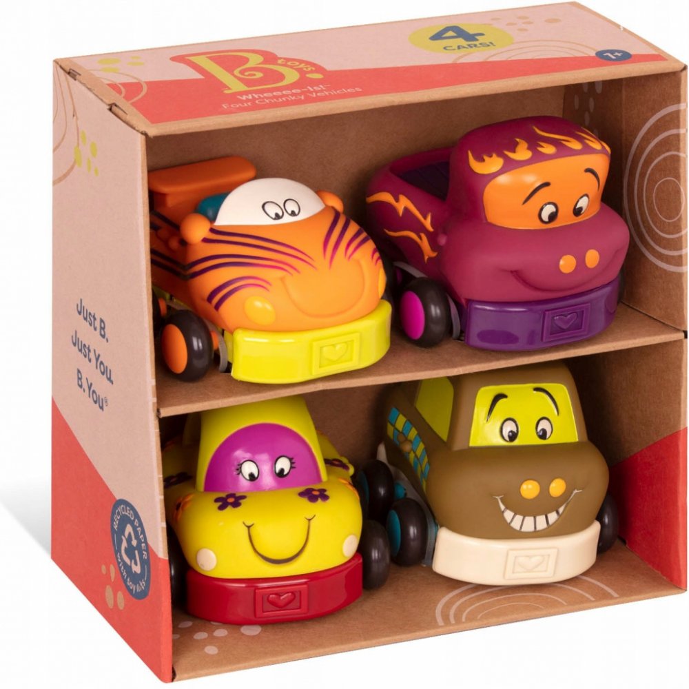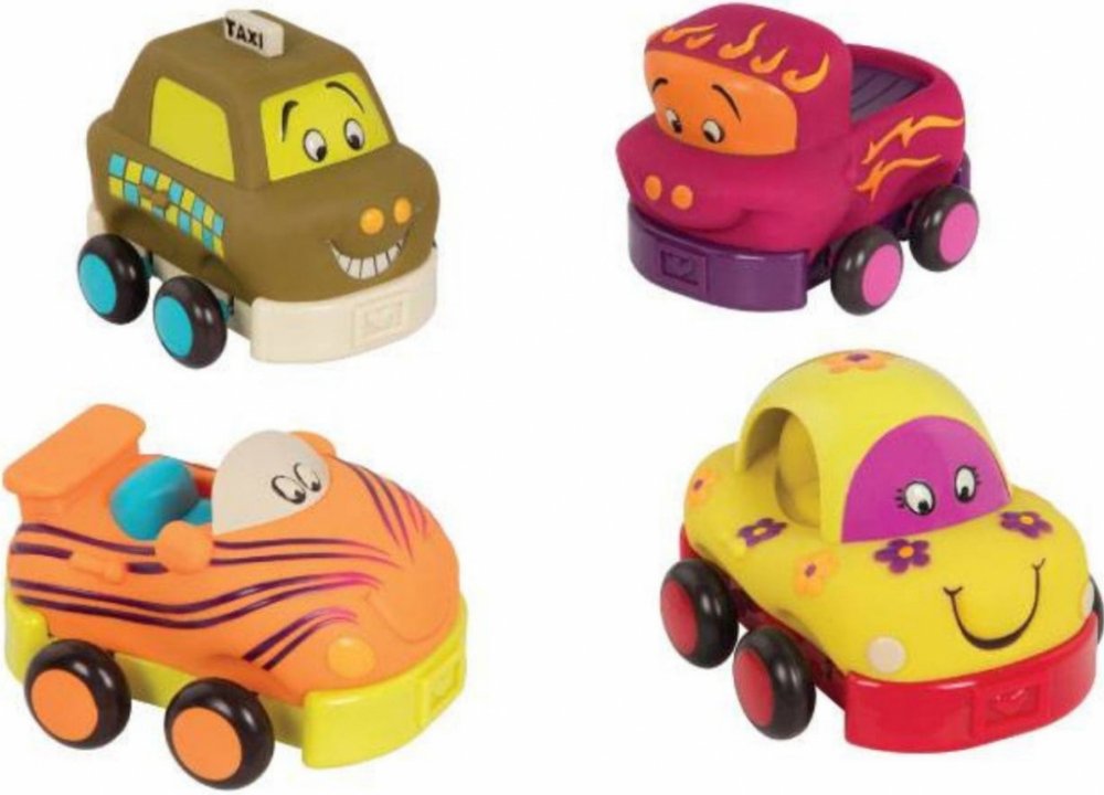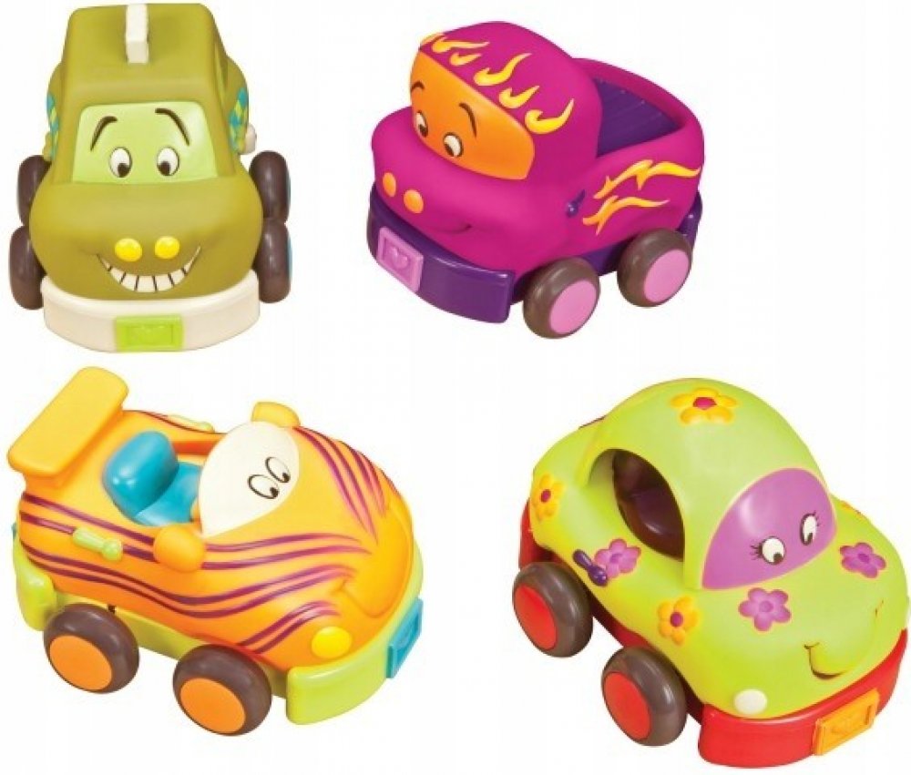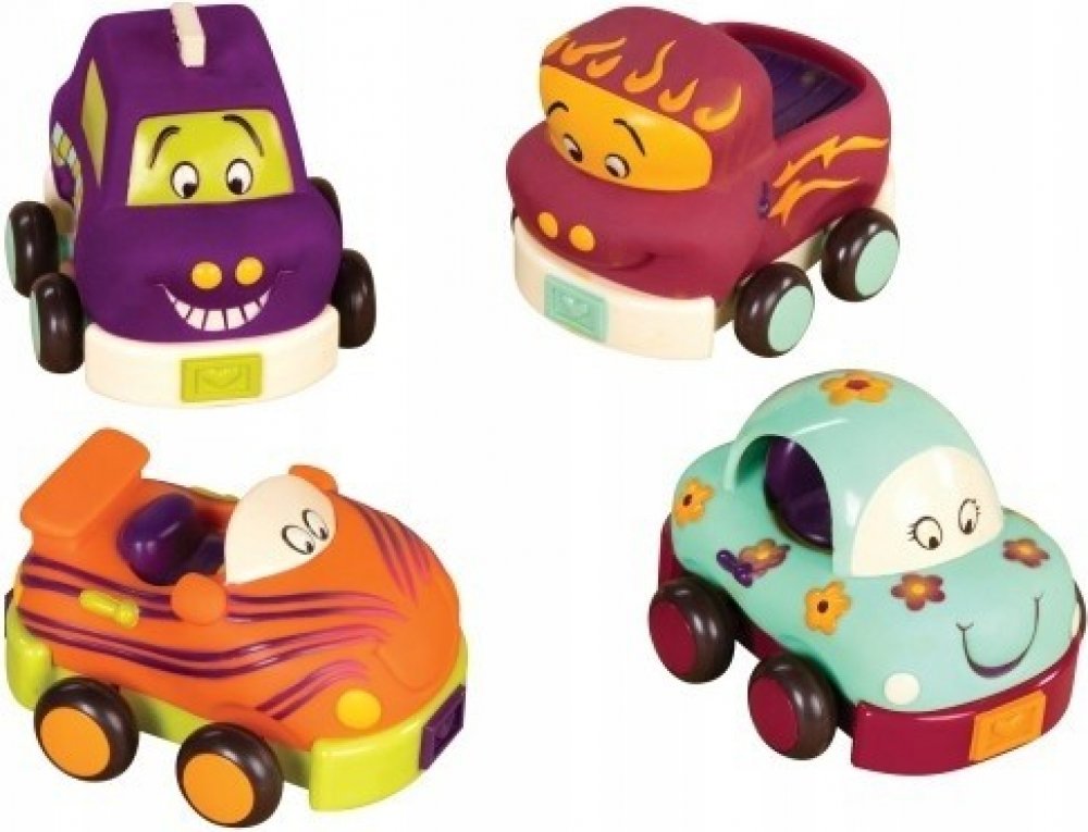 Čtyři měkká plastová autíčka Wheee-ls! jsou ideální pro nejmenší milovníky aut. Autíčka na setrvačník po natažení dozadu samy pojedou kupředu. Po zmáčknutí osobní auto zvoní, náklaďák cinká, závodní auto chrastí a taxík píská. Autíčka jsou vyrobena z příjemného, měkkého materiálu a nepotřebují baterie. Vhodné pro děti od 12ti měsíců.