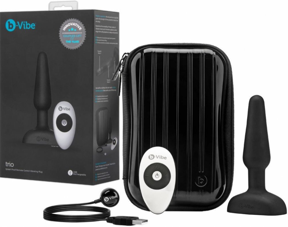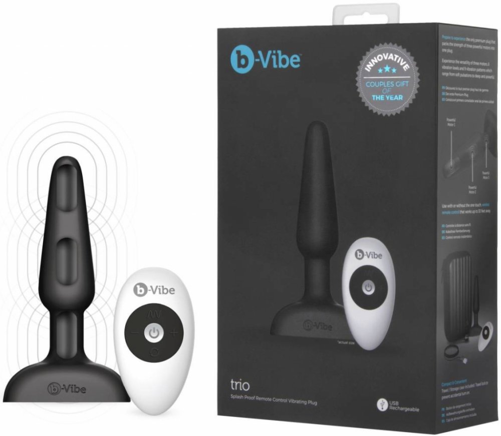 Anální kolík B-Vibe Trio posunuje hranice slasti z anální stimulace o několik úrovní výše, protože pod jeho pláštěm se skrývají tři silné motorky. První se nachází ve špičce, druhý je položen zhruba v polovině zasunovatelné části kolíku a třetí se nachází tam, kde se tělo vibrátoru zase zužuje (viz. video níže). Tyto tři motorky stimulují nejen celý vnitřek, ale také přenáší intenzivně vzrušující vibrace na ústí análního otvoru, které je protkané velkým množstvím nervových zakončení. Uživatelé si mohou vybrat z 8 úrovní týkajících se síly vibrací. Navíc si mohou také vybrat z 9 vibračních módů, které kombinují intenzitu a frekvenci vibrací. Tato nastavení dávají velkou svobodu ve výběru toho, co vám přesně vyhovuje. Pomůcka se dá ovládat přímo tlačítkem na pomůcce, nebo ovladačem, který je součástí balení. Dosah ovladače je cca 10 metrů. Pomůcka je voděodolná, a jako takovou je možné ji vzít s sebou třeba do sprchy. Voděodolnost umožňuje čištění vodou a antibakteriálním mýdlem. Je vyrobená ze silikonu té nejvyšší jakosti, který je hypoalergenní. K nabíjení baterie této pomůcky slouží USB kabel. Nabití prázdné baterie trvá 1,5 hodiny. S plnou baterií budete moci kolík používat po dobu 90 minut. Pohodlí při cestovaní s touto pomůckou zaručuje nejen cestovní zámek, který nedovolí neúmyslné zapnutí, ale také cestovní pouzdro.
