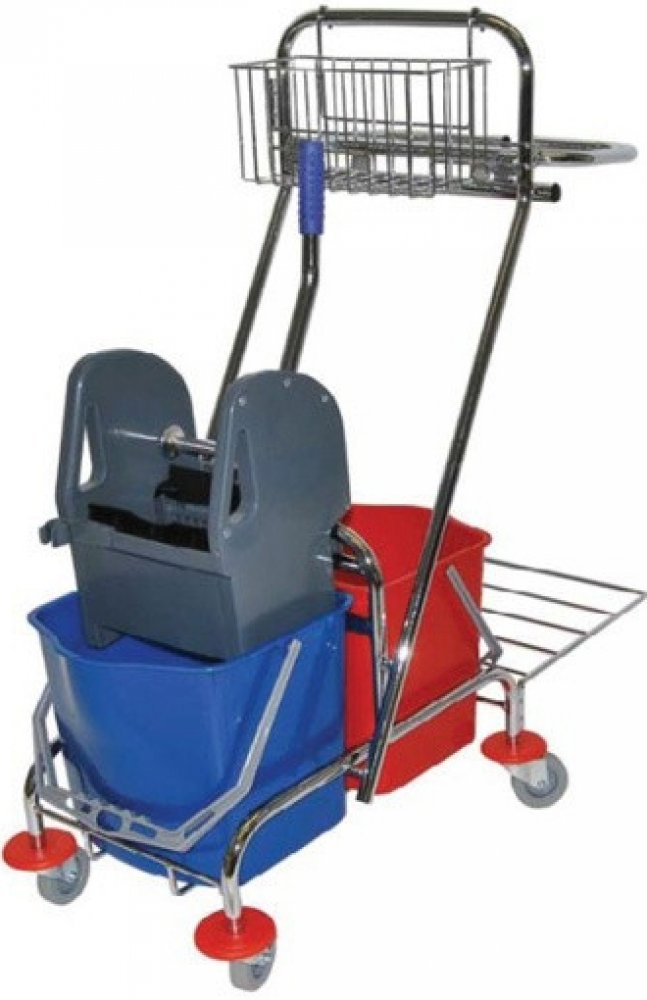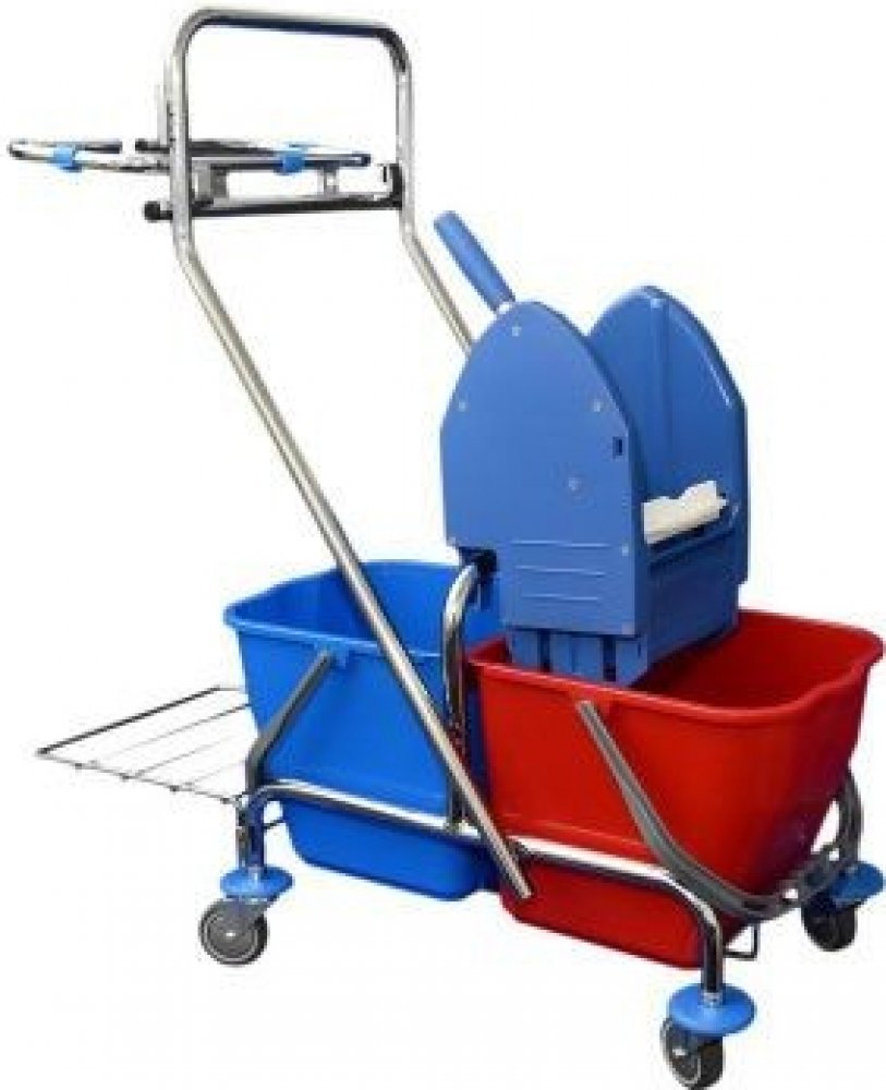 Úklidový vozík 2 x 15 l s pytlem na odpad 120 l Úklidový vozík je vhodný pro úklid malých nebo středních ploch, jako jsou kanceláře, penziony, školy, hotely a všude jinde, kde chtějí pracovat rychle a profesionálně. Vozík obsahuje podvozek 2 x 15 l, kbelík 2 x 15 l, ždímač, držák pytle, který se dá překlápět na obě strany podle potřeby obsluhy. Úklidový vozík se vyznačuje pevnou ocelovou konstrukc...