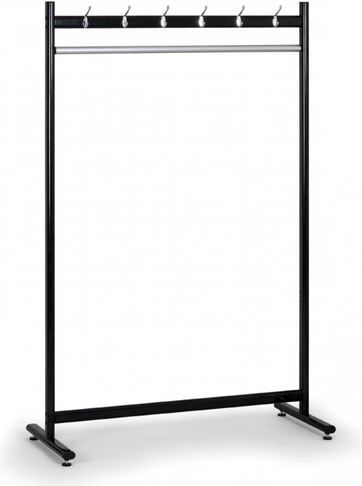 konstrukce vyrobena z ocelových profilů - ovál 50 x 30 mm povrchová úprava práškovým lakem RAL 9005 černá a RAL 9006 stříbrná variabilní věšák s mnoha možnostmi sestavení - tyč se 6 háčky nebo oboustranná tyč s 12 háčky na oděvy a kloubouky, tyč na ramínka či rošt na odložení tašek a bot, lze různě kombinovat možnost zakoupit věšák s kolečky o průměru 50 mm a výšce 80 mm, nebo s nožkami o výšce 30...