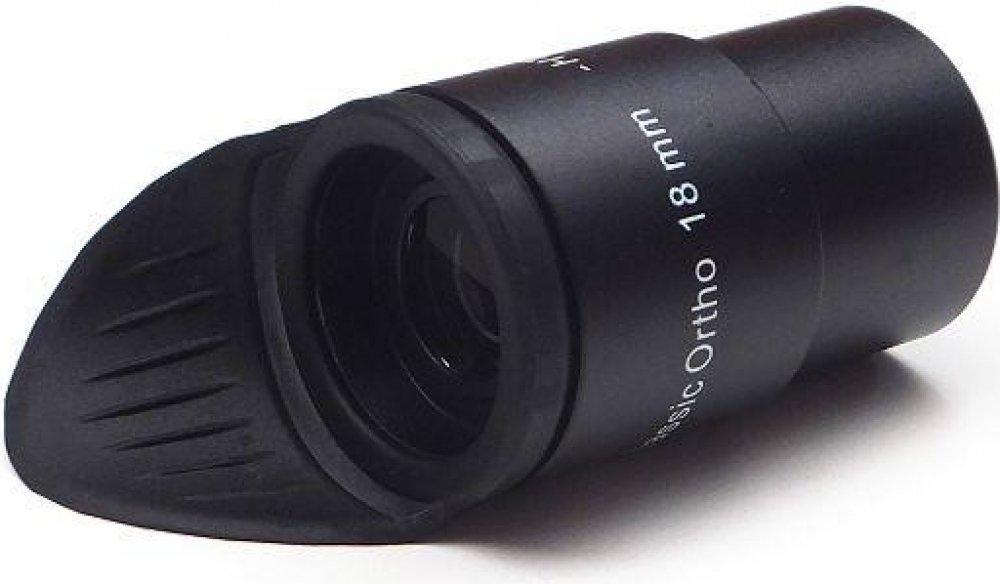 Orthoskopický okulár, upínací průměr 1.25", zorné pole 52°, f = 18 mm. Gumová očnice s mušlí.