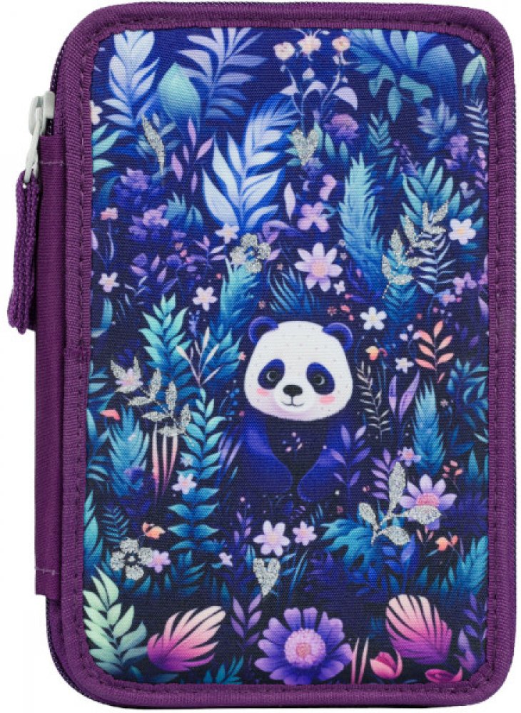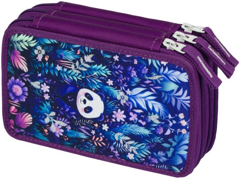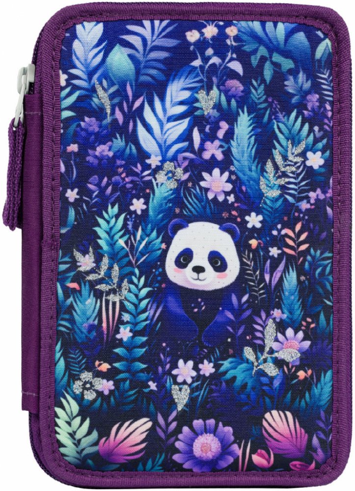 Třípatrový penál Baagl – Jungle Panda je skvělou volbou pro malé školačky, které mají rády zvířecí motivy a originální design. Roztomilá panda v džungli s lístky a přírodními prvky na fialovém podkladu okouzlí na první pohled.