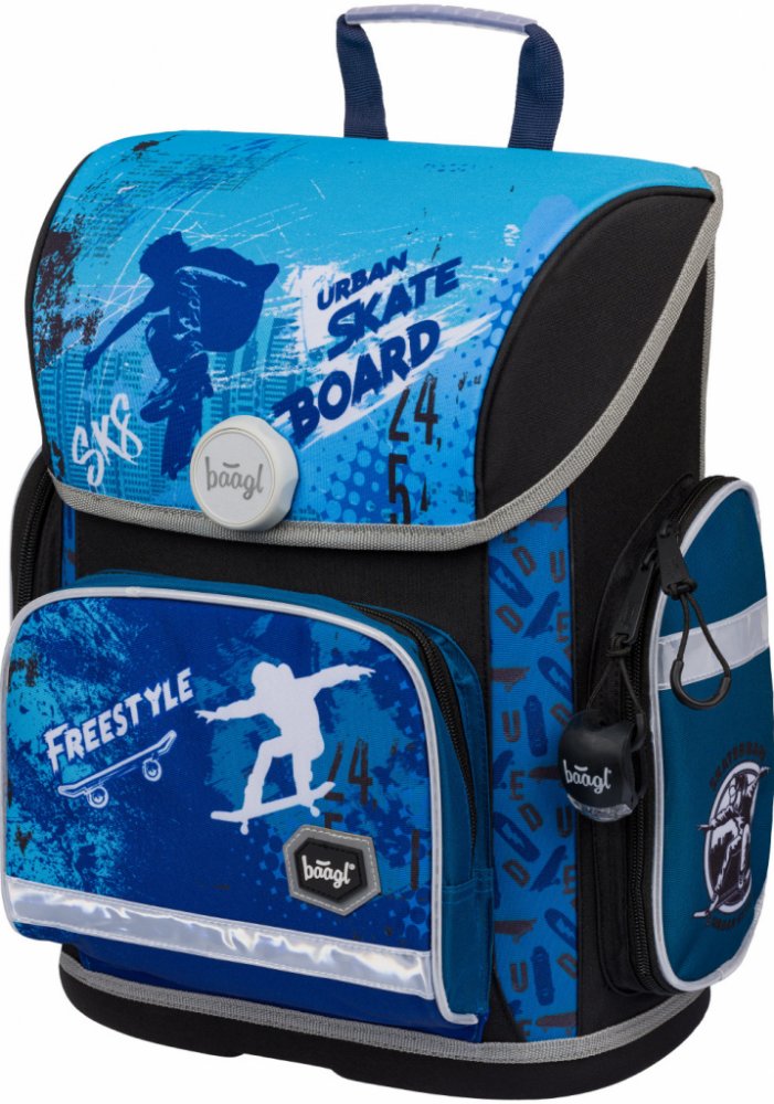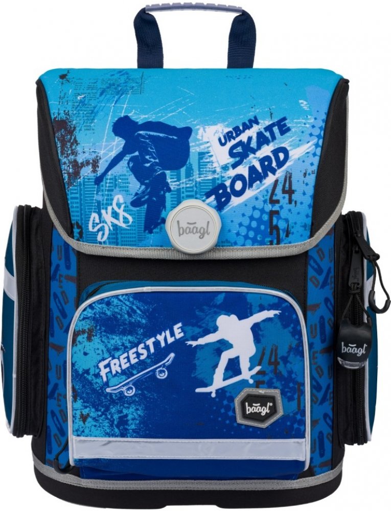 Školní aktovka značky Baagl s motivem skate na přední části v modré barvě, vhodná pro žáky 1.-2. třídy ZŠ. Školní aktovka s vyztuženým tělem, vnitřním organizérem a třemi oddělenými kapsami a zapínáním na kvalitní přezku. Aktovka byla úspěšně testována v ITC Zlín.