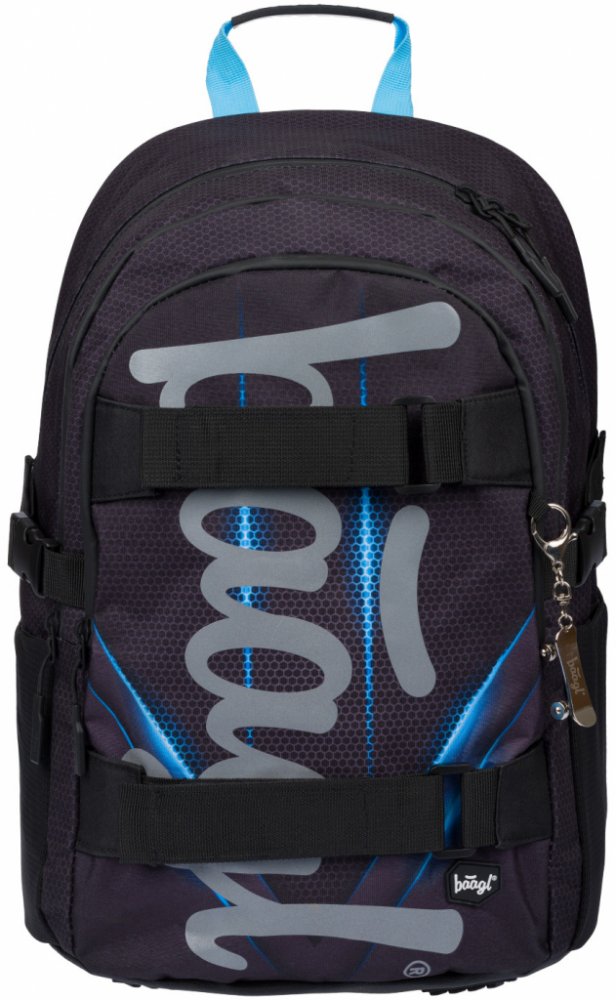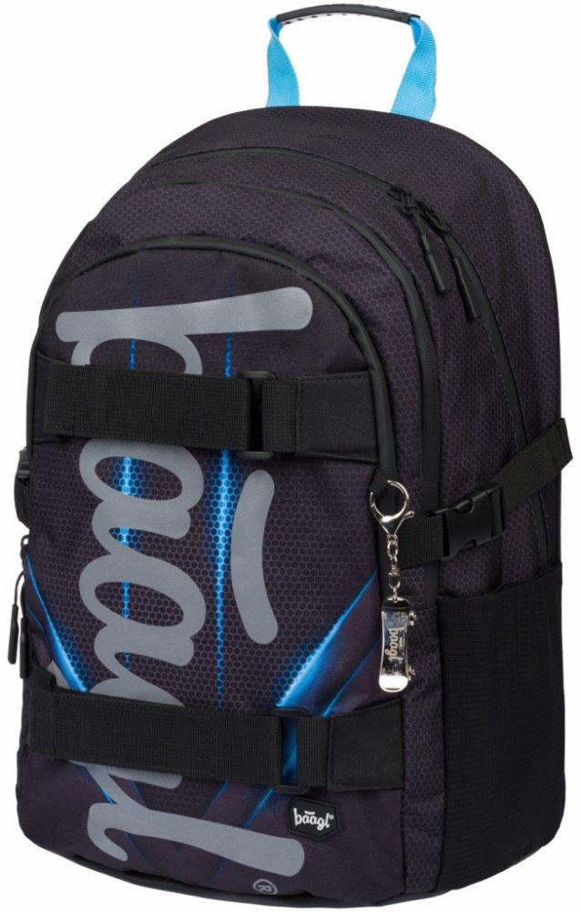 Školní unisex batoh české značky Baagl v černé barvě s modrým potiskem. Batoh je opatřen reflexním logem Baagl na přední straně. Je vhodný od 3. třídy prvního stupně základní školy, ale také pro druhý stupeň základní školy.