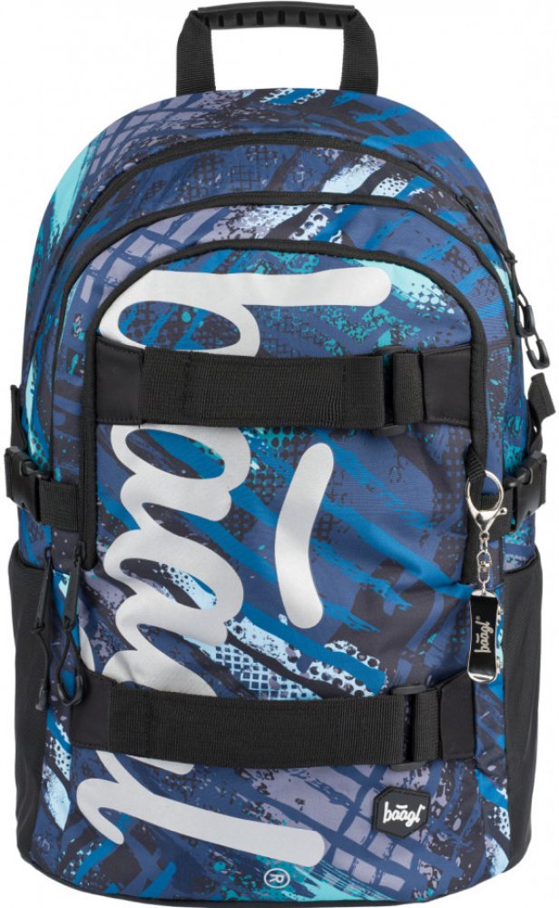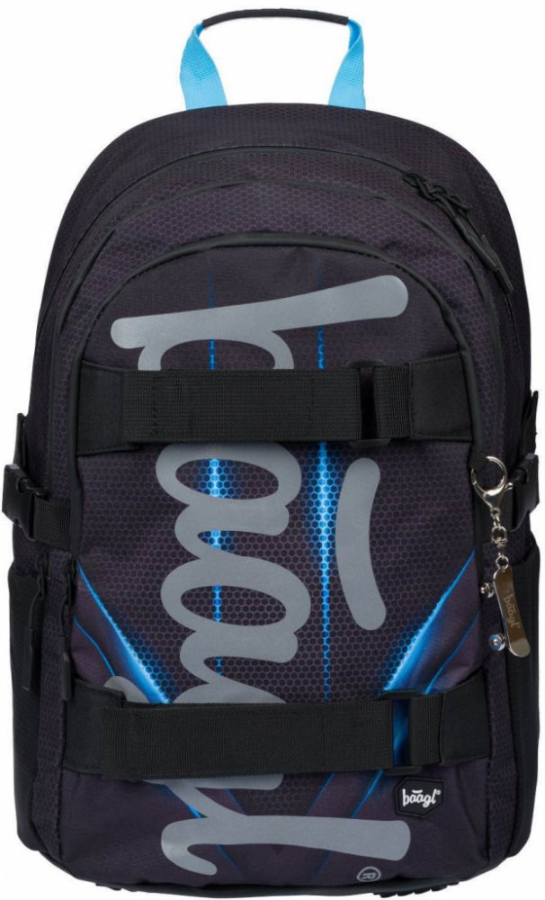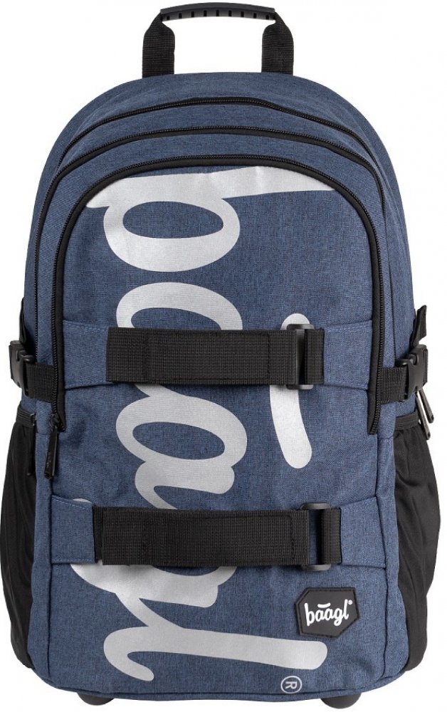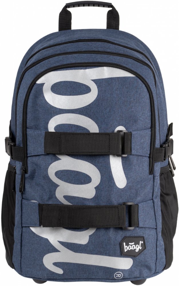 Školní batoh Skate Blue s reflexním logem Baagl na přední straně, vhodný od 3. třídy 1. stupně ZŠ a také pro 2. stupeň ZŠ. Batoh byl úspěšně testován v ITC Zlín.