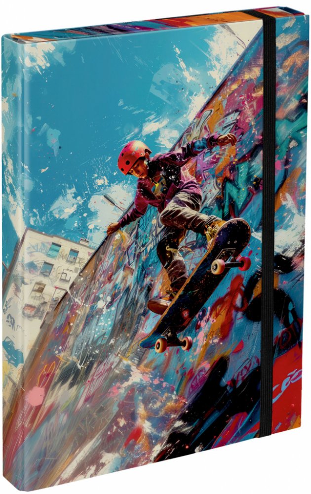 Ochranné desky z tvrdého kartonu na úschovu sešitů či jiných dokumentů, včetně přední klopy proti vypadnutí. Desky jsou opatřené gumičkou, která brání samovolnému otevření. Lesklý lakovaný povrh zvyšuje odolnost.