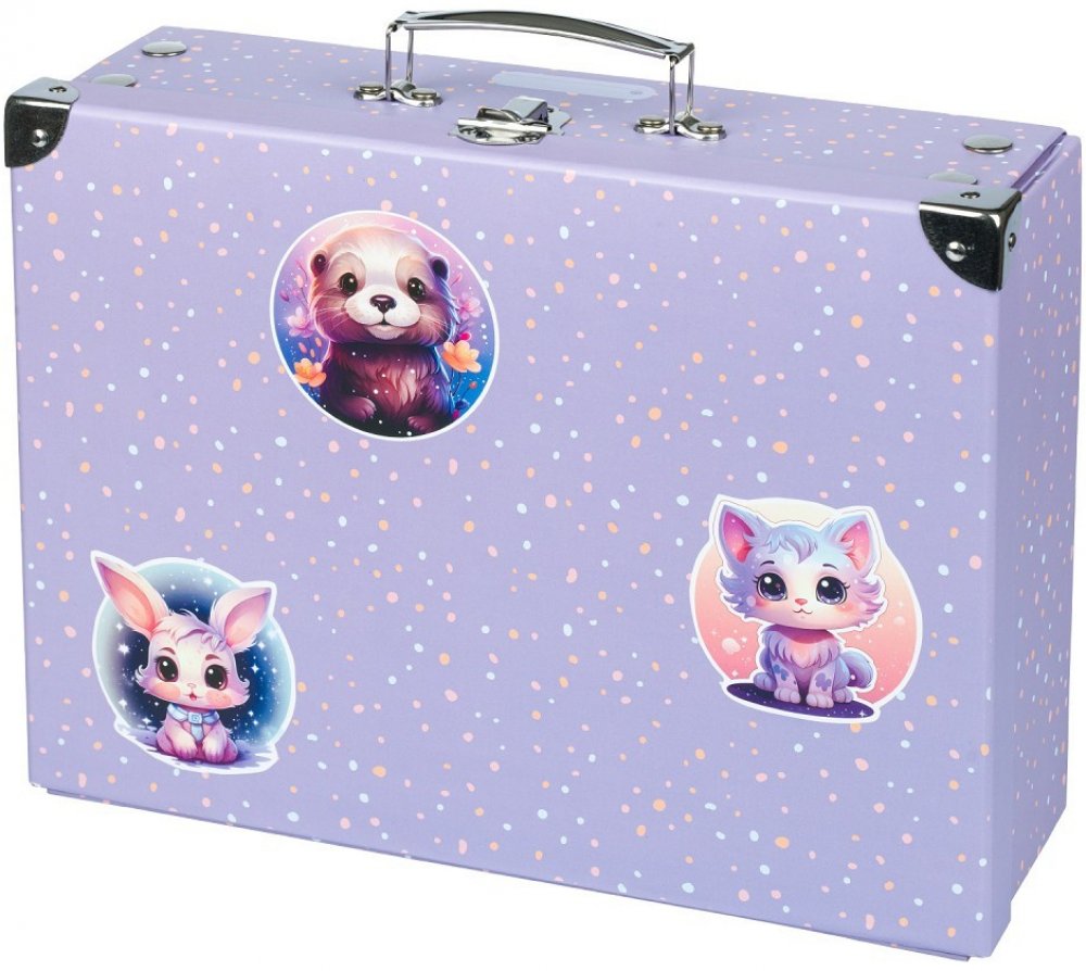 • Skládací kufřík z pevného laminovaného papíru s okovanými rohy.