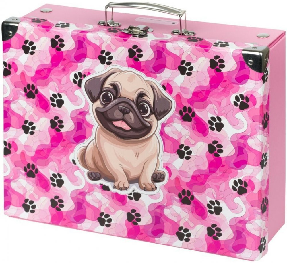 Roztomilý kufřík s motivem psích tlapek je ideální společník pro malé školáky i milovníky čtyřnohých kamarádů. Skvěle poslouží na výtvarné potřeby, pastelky nebo oblíbené drobnosti. Pevná kartonová konstrukce a kovové kování zaručují dlouhou životnost. A když ho nepotřebujete, jednoduše ho složíte.