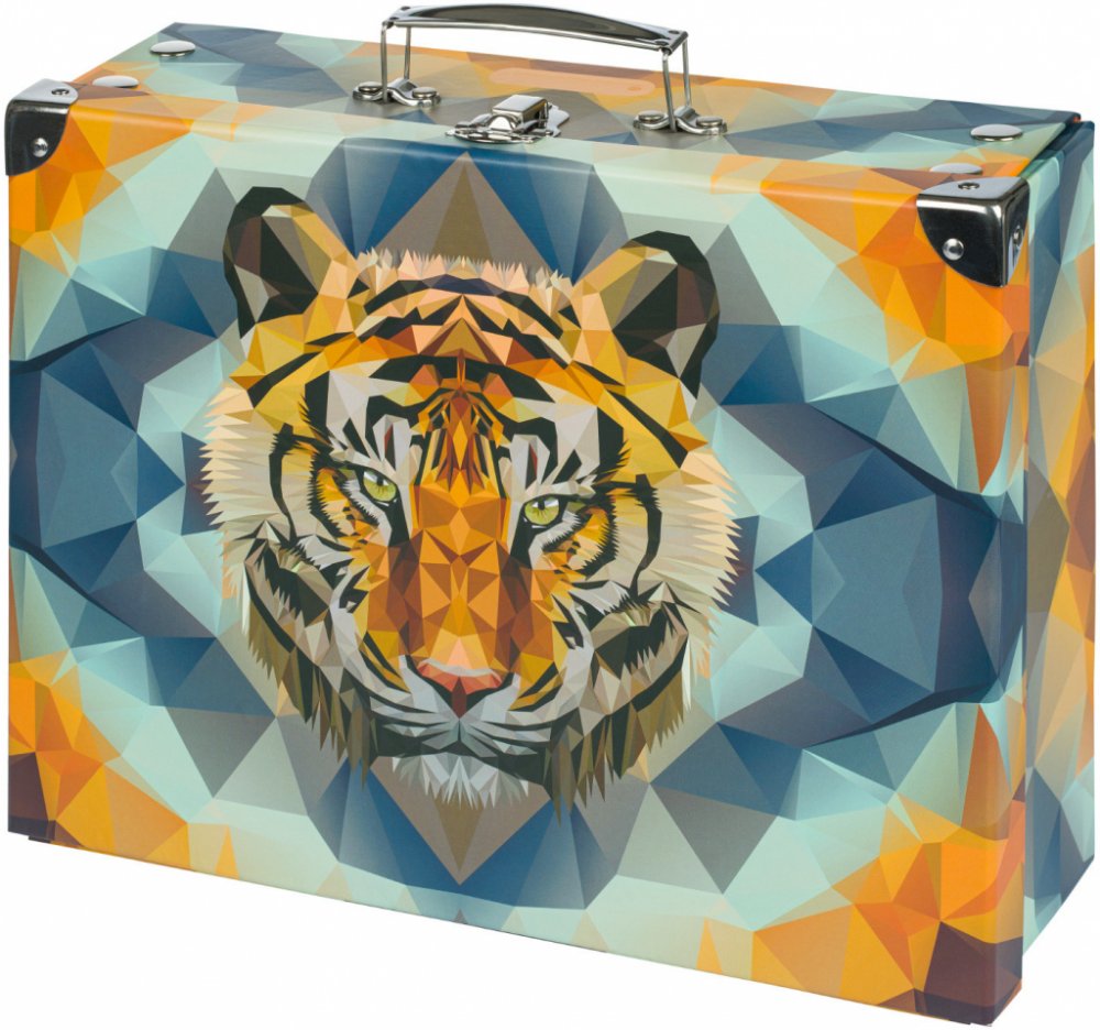 Papírový znovu rozkládací kufřík s designem divokého tygra na moderním abstraktním pozadí. Jednoduchý systém skládání pomocí patentků.
