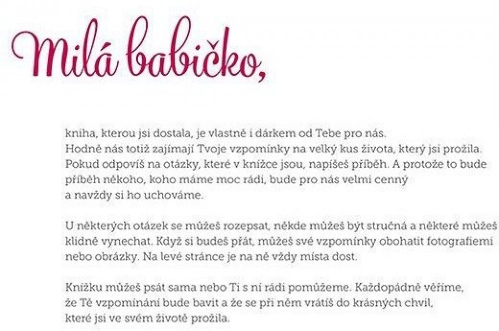 Otevřená kniha pro zaznamenání vzpomínek vaší babičky od dětství po současnost. Babička bude moci sama nebo s vaší pomocí vyplňovat knížku a odpoví tak na celou řadu pečlivě vybraných otázek. Namátkou: čím chtěla být, když byla malá, jací byli její rodiče a prarodiče, kde si hrála, kdy potkala dědečka – svého muže, co spolu zažili, jak vnímala babička historické události, co se podle ní dnes změni...