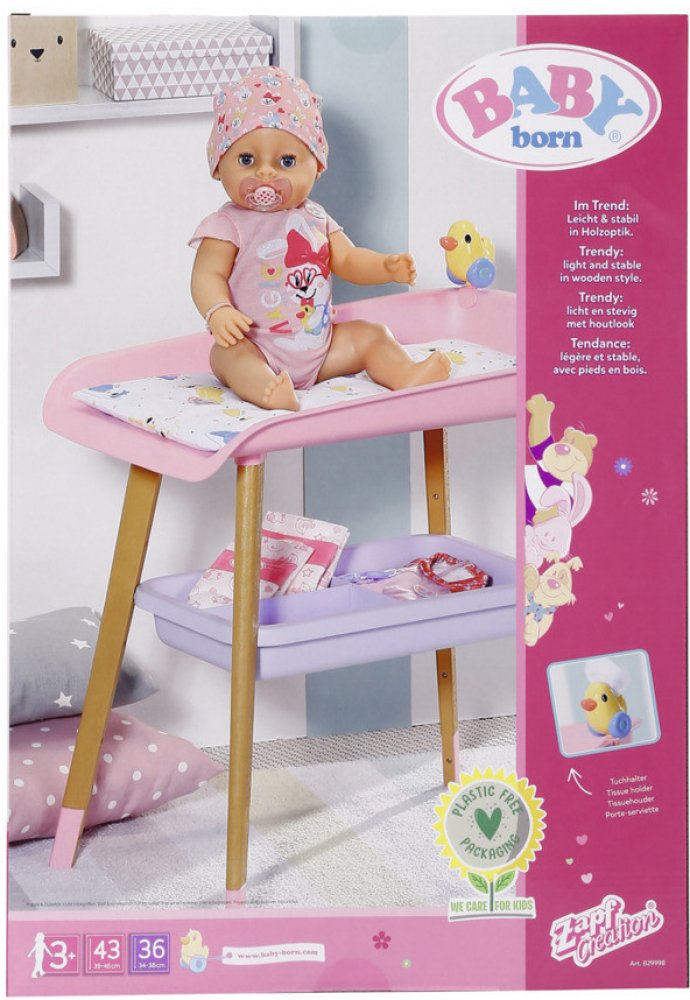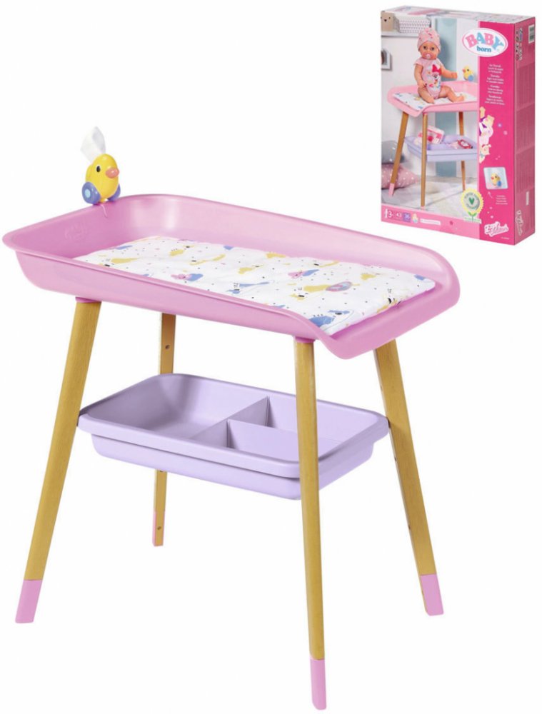 Špatně přebaleno? To se s přebalovacím stolem BABY born nemůže stát. Stůl ve skandinávském stylu má nohy ve vzhledu dřeva a skvěle se hodí do dětského pokojíčku k Jídelní židličce a Stojanu na oblečení. Zatímco panenka BABY born leží na měkké přebalovací podložce, kačenka Berta sleduje přebalování a kromě toho, že BABY born utěšuje, také nabízí ubrousky. V trojdílné přihrádce pod přebalovací podlo...