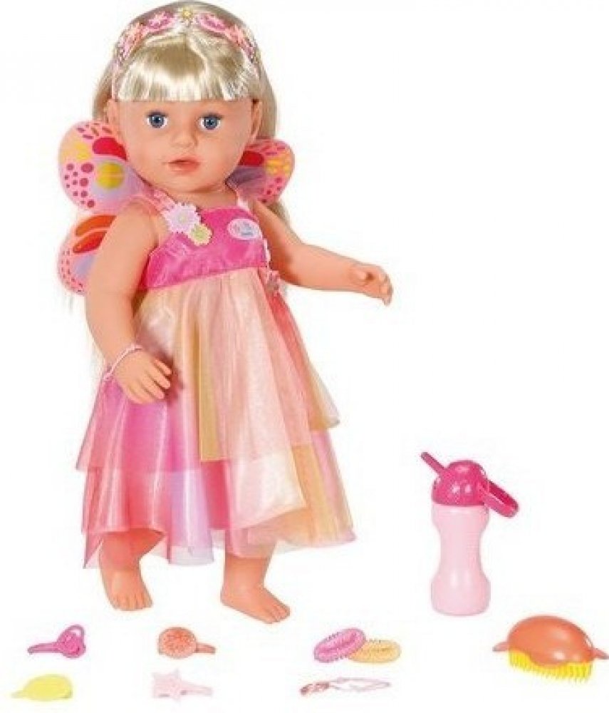BABY born Soft Touch Fantasy Sister 43 cm s šaty, čelenkou a křídly. Zahrnuje láhev, kartáč na vlasy, 2 spirálové pásky, 4 sponky do vlasů a 1 náramek přátelství pro dítě a panenku.